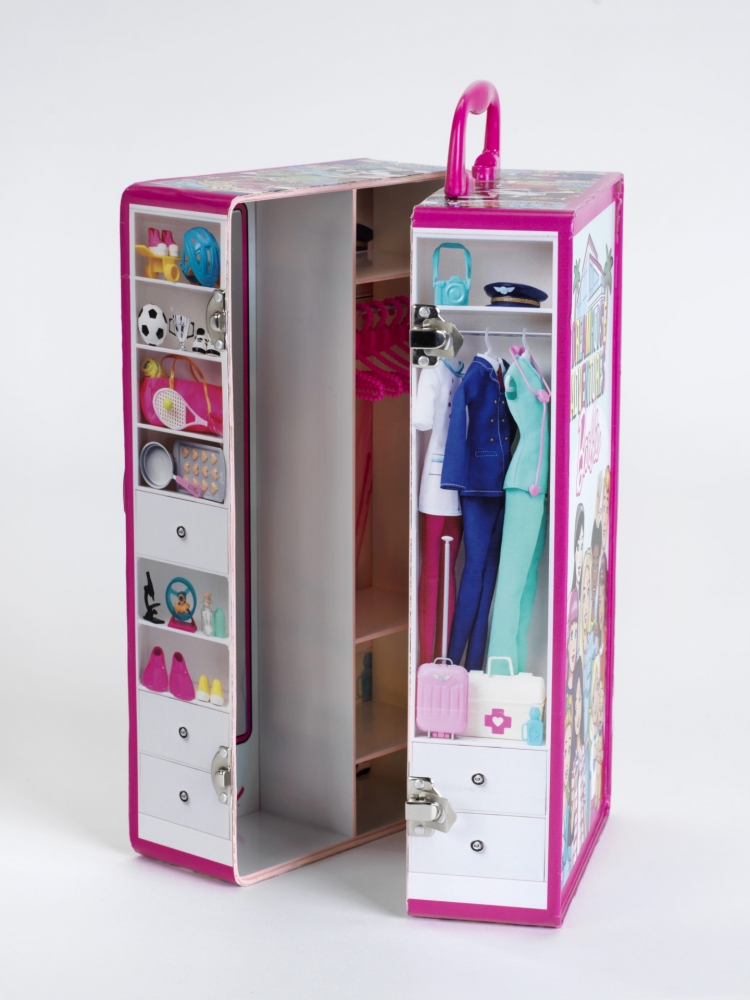 Puszka będąca zabawkową szafą-garderobą dla lalek Barbie jest w kolorze różowym z ozdobną komiksową grafiką przedstawiającą Barbie wraz z przyjaciółmi. Zabawka została wykonana z metalu, posiada plastikową rączkę oraz metalowy zamek, który zabezpiecza ją przed przypadkowym otwieraniem się. Wewnątrz kuferka znajduje się miejsce dla dwóch lalek oraz miejsce na ubrania które można zawiesić na 12 dołączonych wieszakach, lub też poukładać buty czy inne akcesoria na pięciu wydzielonych półkach. Zabawka jest na licencji Barbie,a prezentowany zestaw nie zawiera lalek, ubranek ani innych akcesoriów. Wnętrze jednej połowy kuferka stanowi także imitacje lustra w którym może przejrzeć się mała modnisia. Puszka pozwoli dzieciom na wygodne przechowywanie i przenoszenie ulubionych lalek. Dzięki niej dziecko będzie mogło wszędzie zabrać ze sobą swoje zabawki. Walizka została wykonana z wysokiej jakości materiałów, dzięki czemu będzie służyć przez długi czas.
