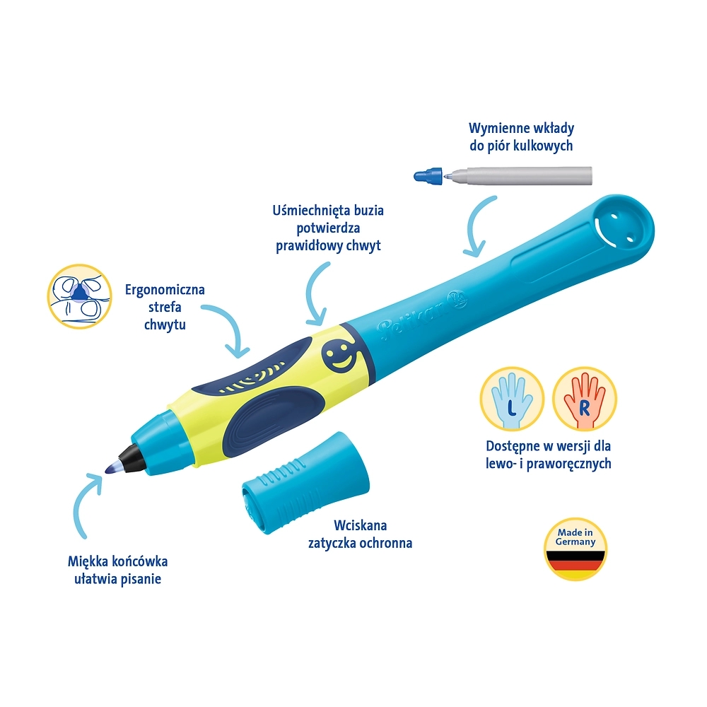 Pióro kulkowe Pelikan Griffix to etap 3 w 4-stopniowym systemie nauki pisania stworzonym przez markę Pelikan. Po opanowaniu rysowania kredkami i pisania ołówkiem, dziecko jest gotowe na kolejny krok – rozpoczęcie nauki pisania piórem. Na tym etapie dzieci nadal doskonalą chwyt szczypcowy, a jednocześnie zaczynają przyzwyczajać się do korzystania z narzędzia piśmienniczego z płynnym atramentem. Ponieważ młodsze dzieci mają tendencję do silniejszego naciskania na papier, pióro zostało wyposażone w specjalną końcówkę, która amortyzuje nacisk i umożliwia miękkie, płynne pisanie bez oporu. Widoczna uśmiechnięta buźka na korpusie podpowiada dziecku, że trzyma pióro prawidłowo. Ergonomiczny, trójkątny uchwyt pokryty został gumowaną powierzchnią, dzięki czemu dłoń się nie ślizga, a dziecko uczy się pisać w sposób wygodny i naturalny. Pióro działa na wkłady atramentowe kulkowe, co czyni je czystym i łatwym w obsłudze.