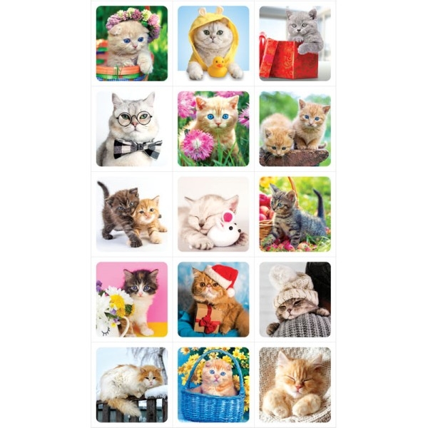 Zestaw 15 naklejek samoprzylepnych z kotkami idealnie nadaje się do wykorzystania przy wszelkich pracach kreatywnych. Naklejkami można ozdobić kartki okolicznościowe, prezenty, notesy, zeszyty i pudełka. Sprawdzą się również jako nagrody motywacyjne.