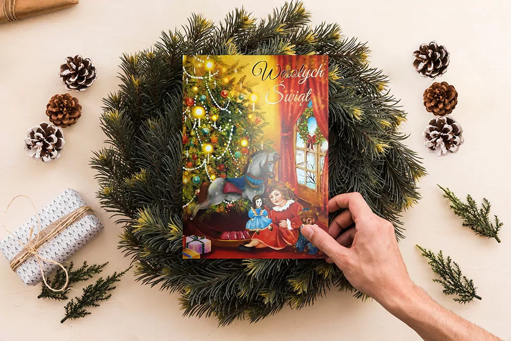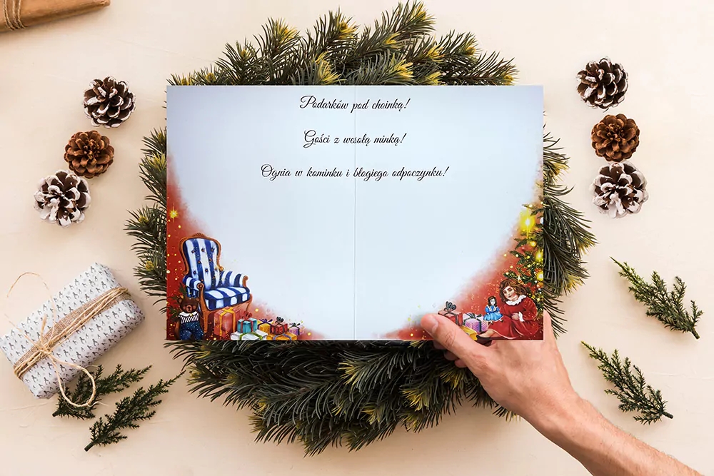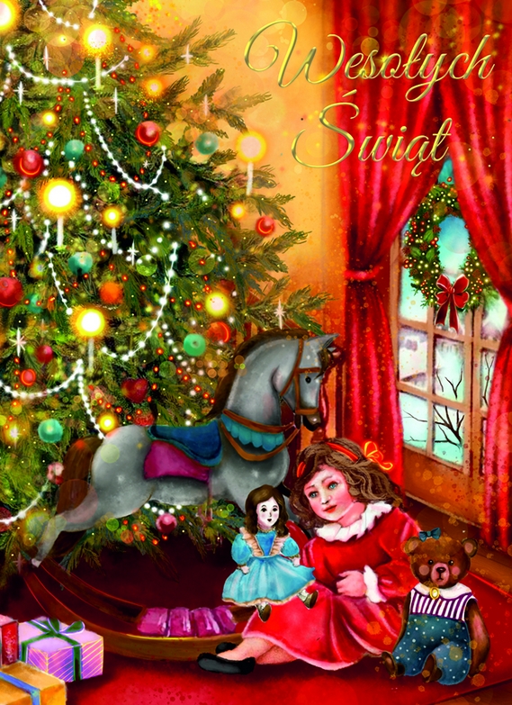 Karnet Bożonarodzeniowy w formacie B6. Karnet wydrukowany na wysokiej jakości papierze, uszlachetniany złotem. W zestawie czerwona koperta.