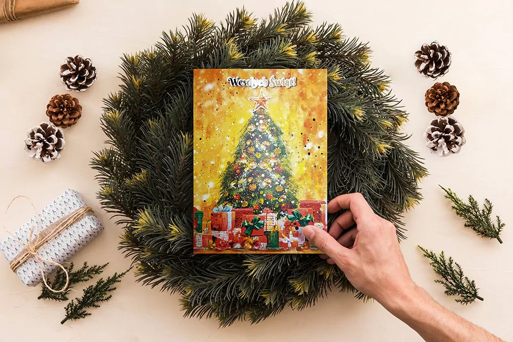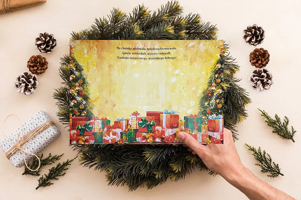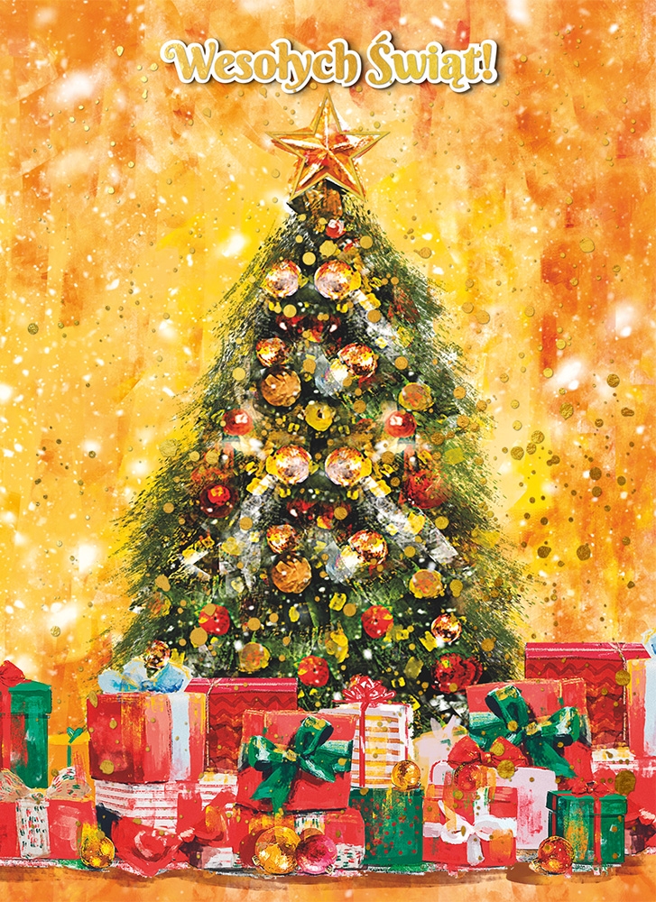 Karnet Bożonarodzeniowy w formacie B6. Karnet wydrukowany na wysokiej jakości papierze, uszlachetniany złotem. W zestawie czerwona koperta.