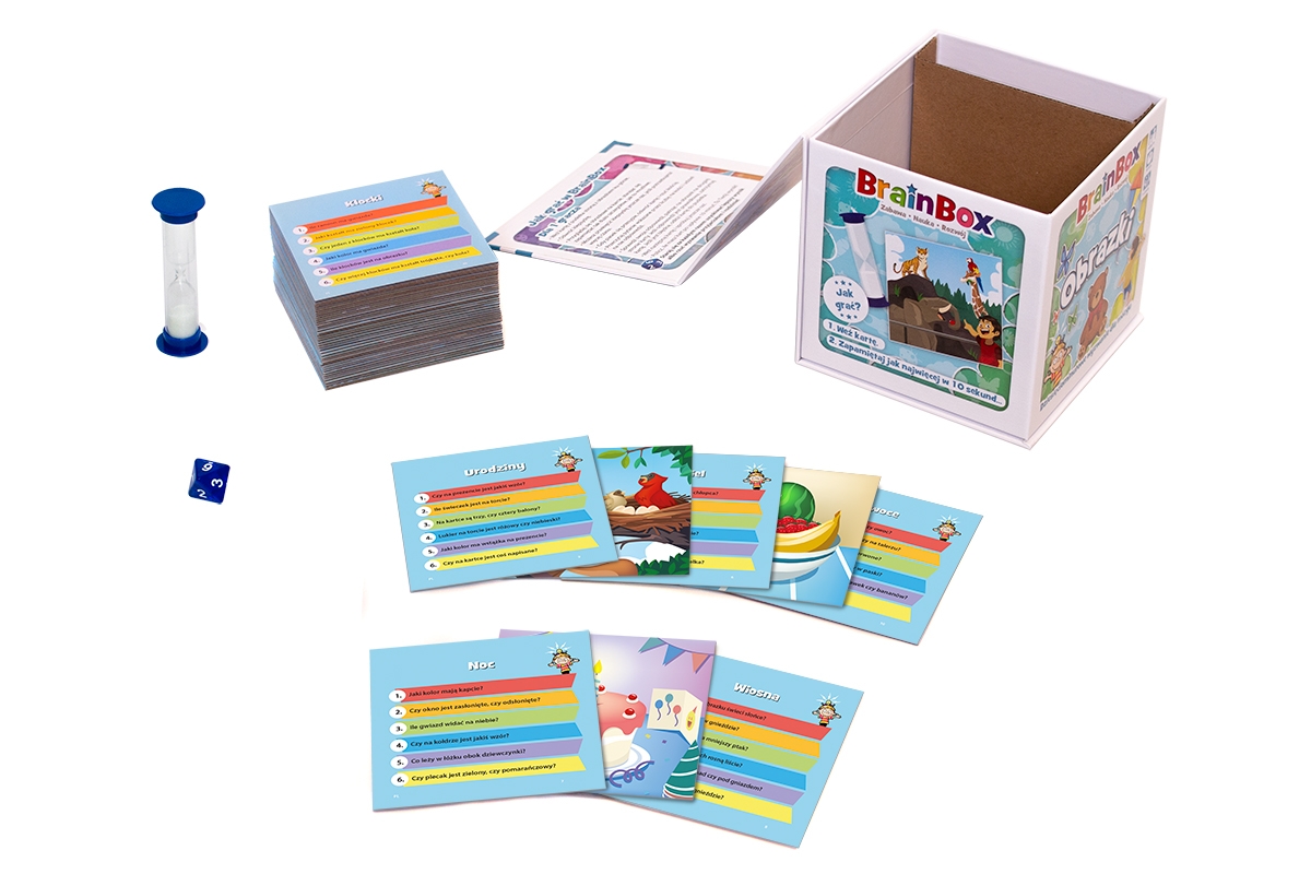 BrainBox - Obrazki spełni Twoje oczekiwania! Zajrzyj do pudełka i odkryj 55 obrazków ze zwierzętami, przedmiotami i codziennymi sytuacjami z życia, które pozwolą Twojemu dziecku poznać nowe słowa i ćwiczyć proste liczenie. Dodatkowo zabawa z BrainBox opiera się na zapamiętywaniu, pozwala więc rozwijać jedną z najważniejszych dziecięcych umiejętności.