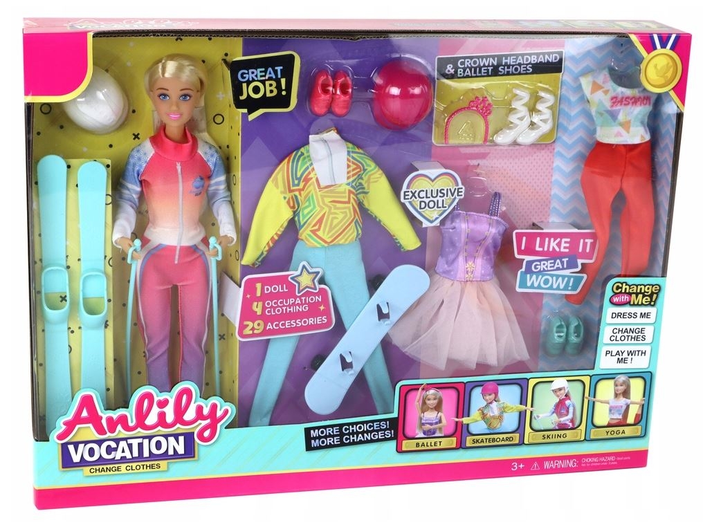 Lalka Dla Dzieci Anlily 4 Sporty Narty Akcesoria Lalka Anlily Sport to wspaniała towarzyszka zabaw, zapewniająca dzieciom mnóstwo kreatywnej rozrywki. Ta urocza lalka ma niebieskie oczy, długie blond włosy do czesania i wymiary 30 cm x 4 cm x 6 cm. W zestawie znajduje się wiele strojów i akcesoriów, które pozwalają dzieciom bawić się w różne role i odkrywać różne dziedziny sportu. Lalka jest ubrana w narciarski strój z białym kaskiem, białymi butami zimowymi, nartami i kijkami. Jednak to jeszcze nie wszystko! W zestawie znajdziesz także kostium baletnicy (fioletowy kostium z różowym tiulowym dołem, różowa opaska na włosy i białe baletki), strój do jazdy na deskorolce (niebieska deskorolka, żółta bluzka z długim rękawem, niebieskie spodnie, różowy kask i różowe sportowe buty) oraz strój do jogi (wygodne pomarańczowe spodnie, kolorowa bluzka z krótkim rękawem i miętowe sportowe buty). Ta lalka ma ruchome i zginane kończyny, co pozwala na realistyczne poruszanie się i odtwarzanie różnych scenek. Wymiary opakowania wynoszą 44 cm x 32 cm x 6 cm. To idealna zabawka, która rozwija wyobraźnię i kreatywność dziecka, zachęcając je do eksplorowania różnych pasji i zainteresowań. Elementy zestawu: - lalka Anlily - strój narciarski, narty oraz kijki - strój baletnicy - strój do jogi - strój na deskorolkę, deskorolka Wymiary lalki: 30 cm x 4 cm x 6 cm Wymiary opakowania: 44 cm x 32 cm x 6 cm Posiada certyfikat CE, ponadto jest zgodny z normą EN71. Zabawka przeznaczona jest dla dzieci powyżej 3 roku życia.