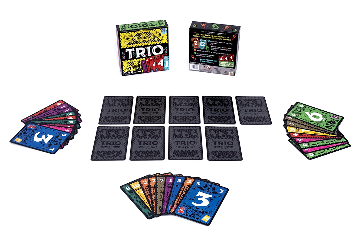 Trio to ekspresowa gra karciana, w której zgadywanie łączy się z zapamiętywaniem. Każdy z uczestników ma na ręce kilka kart uszeregowanych od najniższej do najwyższej, podczas gdy pozostałe leżą zakryte między nimi. Naszym celem jest odkrycie w jednej turze trzech kart o jednakowej wartości. Na początku wybieramy dwie: ze stołu lub z ręki dowolnego gracza (w tym drugim przypadku możemy wybierać tylko skrajne karty). Jeśli mają tę samą wartość, powtarzamy czynność, a jeśli zdobędziemy trzecią, punktujemy! W przypadku porażki karty wracają na swoje miejsce, co ułatwia zadanie kolejnym graczom – przynajmniej tym, którzy będą uważnie śledzili sytuację wokół stołu.