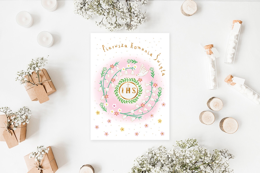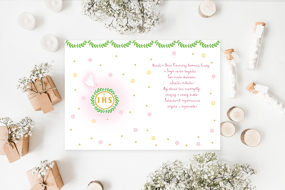 Karnet A5 KOMUNIA GOŁĄB RÓŻOWY wydrukowany na wysokiej jakości papierze formatu A5 i jest uszlachetniany złotem i tłoczony. Teksy życzeń w środku. W zestawie koperta.