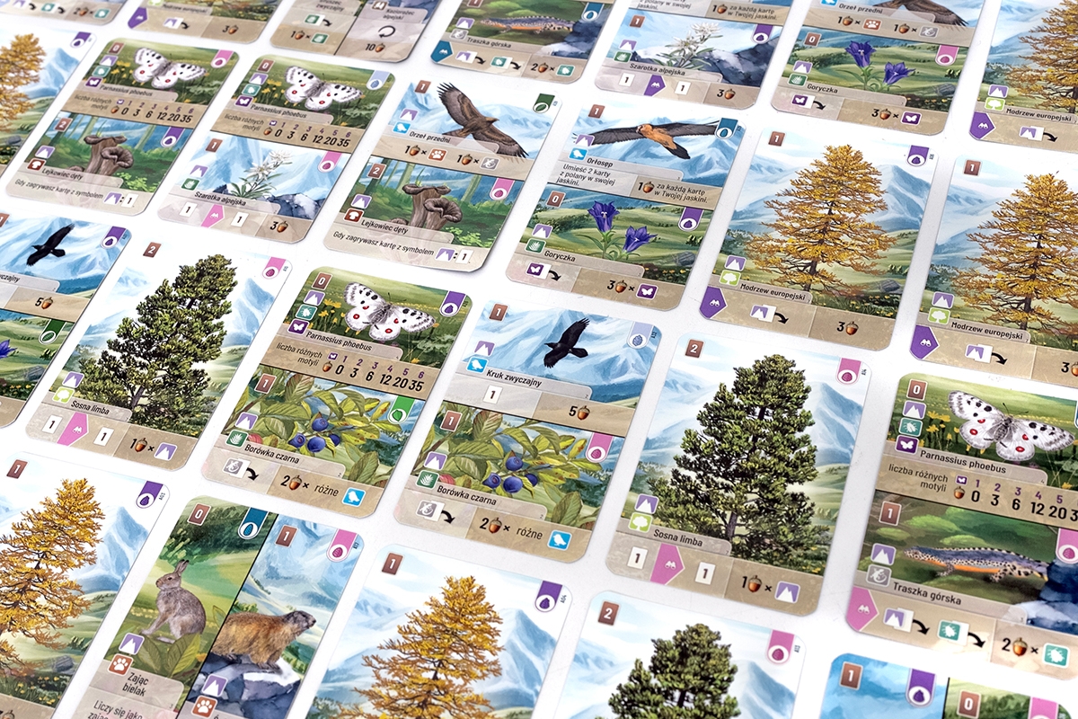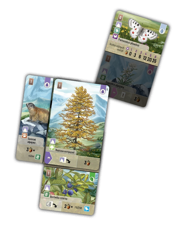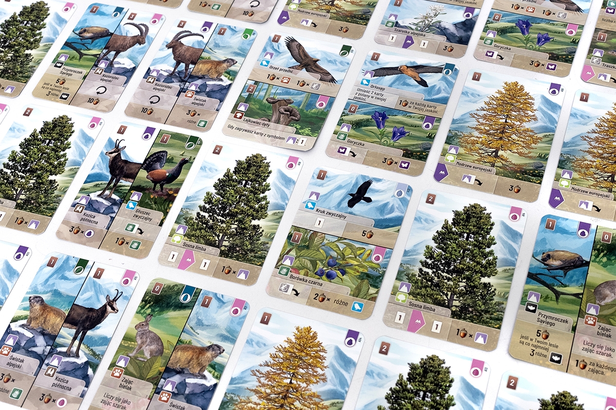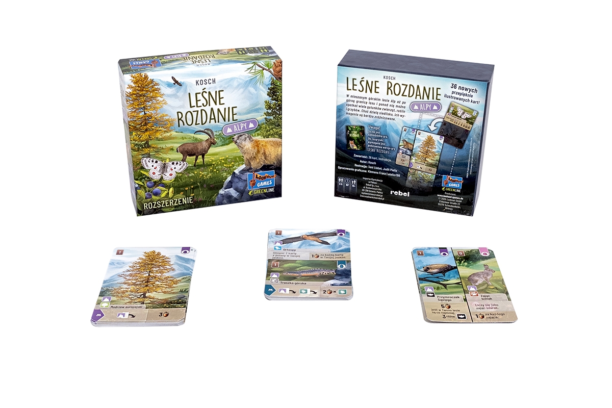 Leśne rozdanie: Alpy to rozszerzenie wprowadzające 36 zupełnie nowych, przepięknie ilustrowanych kart z alpejską fauną i florą. Znajdziesz wśród nich 2 dodatkowe gatunki drzew, nowy rodzaj motyla oraz zwierzęta, rośliny i grzyby, które urozmaicą Twoje rozgrywki i pozwolą na wypróbowanie nowych strategii.