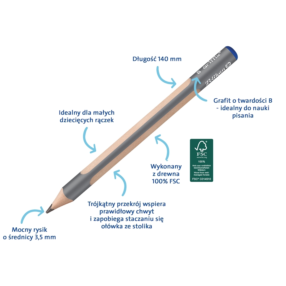 Drewniany ołówek Pelikan Griffix został zaprojektowany z myślą o najmłodszych użytkownikach, którzy uczą się pisać i rysować w naturalny sposób. Jego ergonomiczny, trójkątny kształt wspiera rozwój prawidłowego chwytu i zapewnia wygodne ułożenie dłoni. Dzięki drewnianej, lakierowanej oprawie wykonanej z certyfikowanego drewna FSC, ołówek nie tylko świetnie wygląda, ale też jest przyjemny w dotyku, odporny na zabrudzenia i przyjazny dla środowiska. Może być używany przez dzieci zarówno prawo-, jak i leworęczne, co czyni go uniwersalnym narzędziem do codziennego pisania i szkicowania – w szkole, w domu i na zajęciach plastycznych.