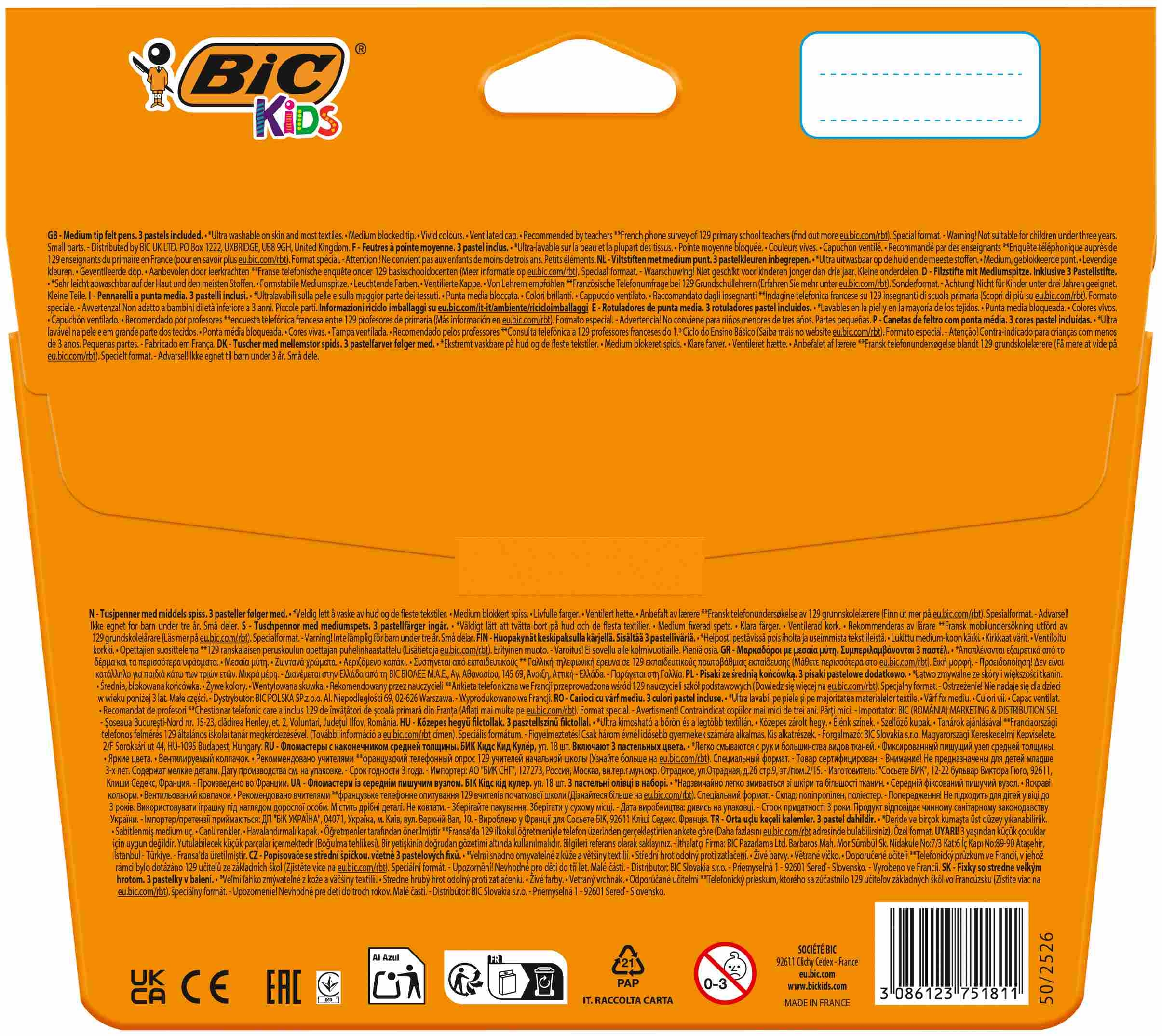 Flamastry BIC Kids Kid Couleur Pastel w opakowaniu 18 sztuk z tuszem na bazie wody bardzo łatwo zmywają się z dłoni i spierają z większości tkanin. Wyposażone są w średniej grubości końcówkę, która nie wciska się do środka.