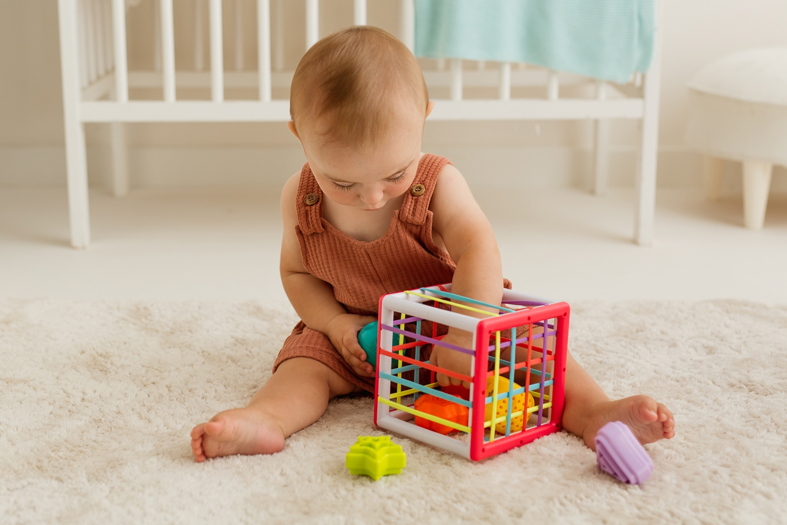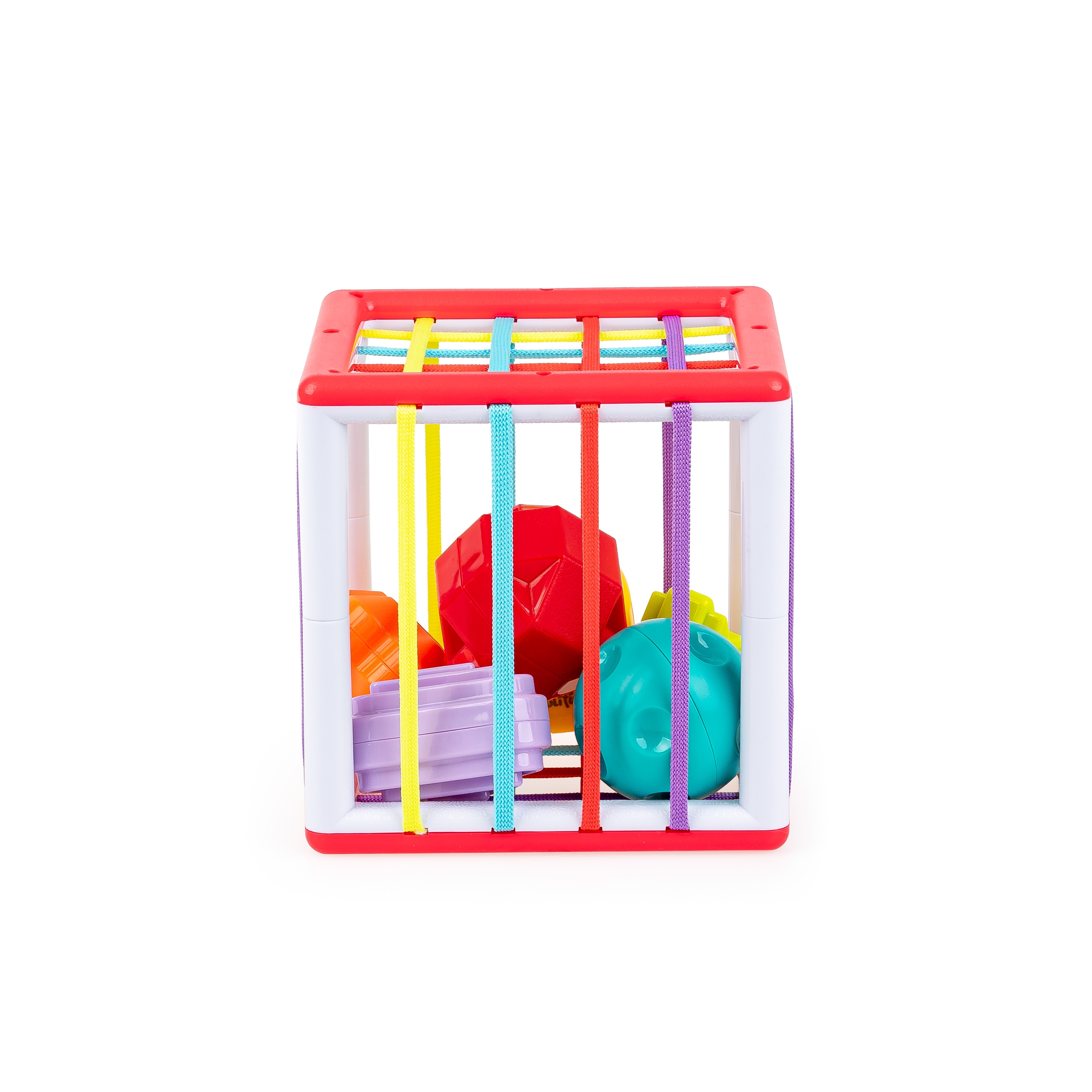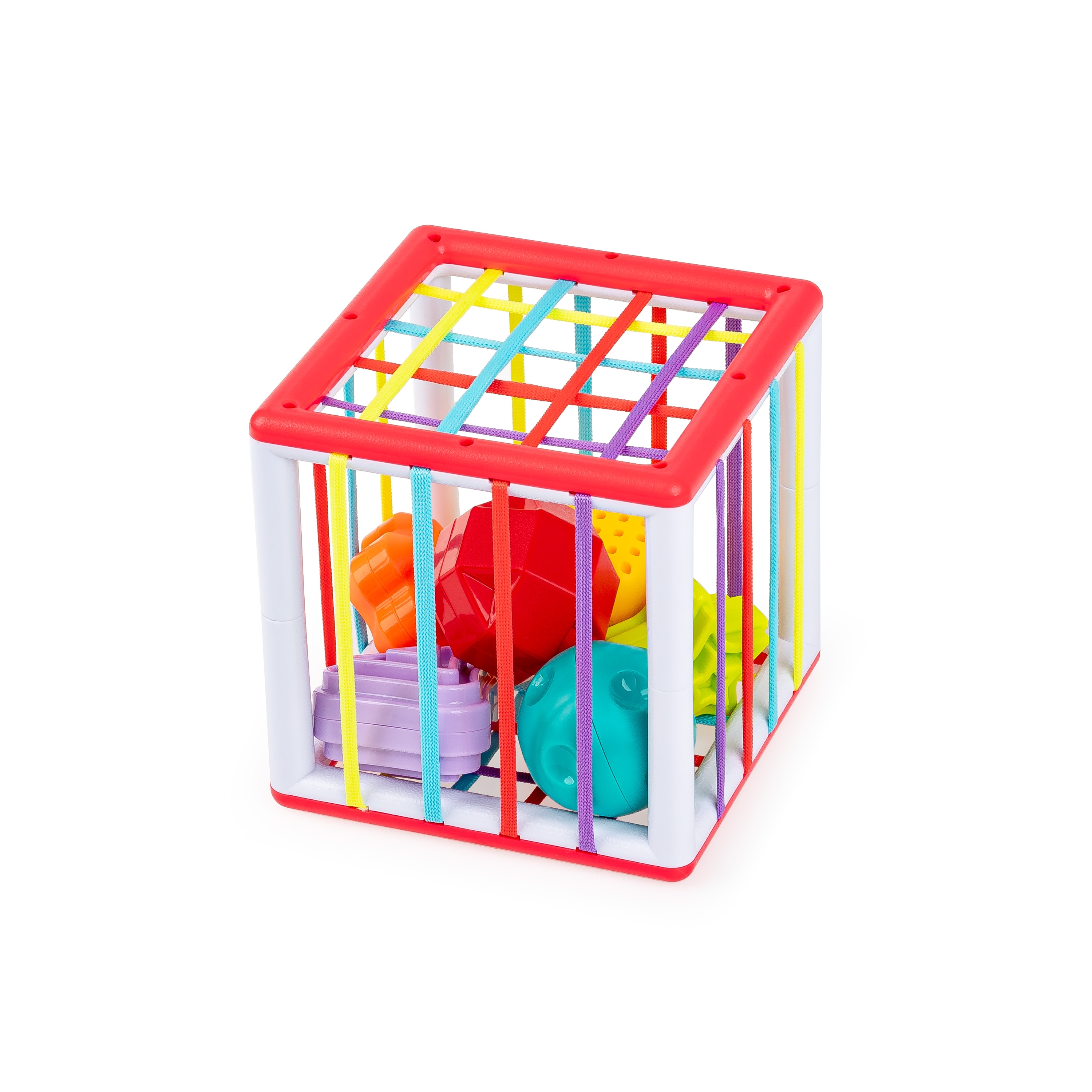 Kostka z elastycznymi ściankami kryje w swym wnętrzu całą gromadkę kolorowych klocków! Ta inspirująca zabawka pozwoli najmłodszym odkrywcom poznać różnice pomiędzy poszczególnymi kształtami klocków, ich kolorem, a także fakturą. Poza stymulowaniem zmysłu wzroku i dotyku, zabawka oddziałuje także na zmysł słuchu maluchów, a to za sprawą grzechotania, które bobas usłyszy za każdym razem, gdy potrząśnie którymś z klocków. Dzięki temu, że sznureczki, tworzące ścianki kostki, są elastyczne, klocki można do woli wkładać do zabawki i wyciągać je na zewnątrz.