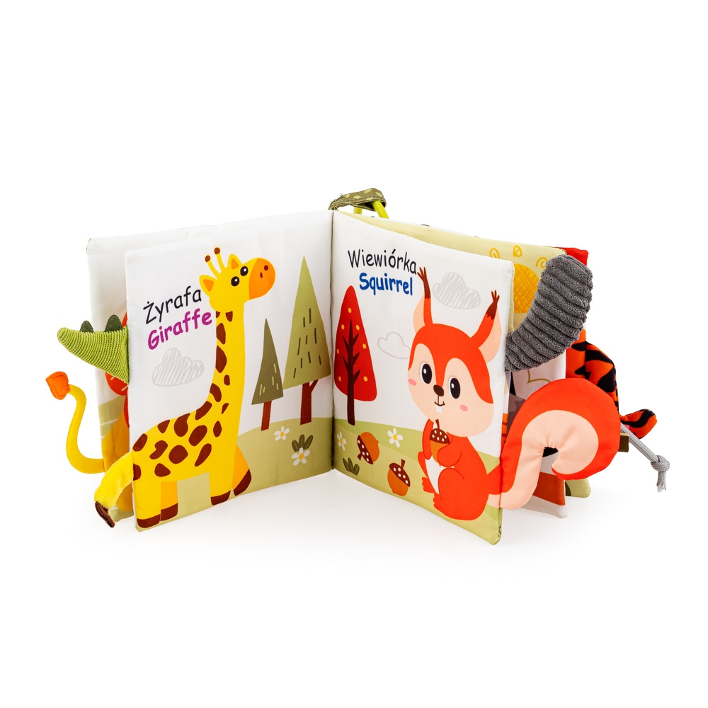 Co kryją w sobie dżungla czy leśne zarośla? Materiałowa książeczka zapozna najmłodszych z dzikimi zwierzakami, żyjącymi z dala od ludzi. Niektóre są bardziej płochliwe, inne mniej, ale wszystkie łączy dzika natura. Na stronach książeczki, na maluchy czekają różne zwierzątka, ich nazwy w języku polskim oraz angielskim, a także ich ogonki, różniące się kształtem i fakturą materiału, z którego zostały wykonane. To świetny pomysł na przeżycie sensorycznej przygody bez wychodzenia z domu!
