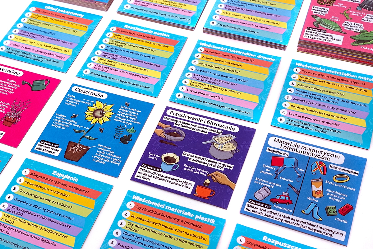 Każde pudełko to zestaw kart, które po jednej stronie mają obrazek (należy przyjrzeć mu się przez określony czas), a z drugiej zestaw pytań, sprawdzających nie tylko naszą pamięć, ale też wiedzę z zakresu danego przedmiotu.