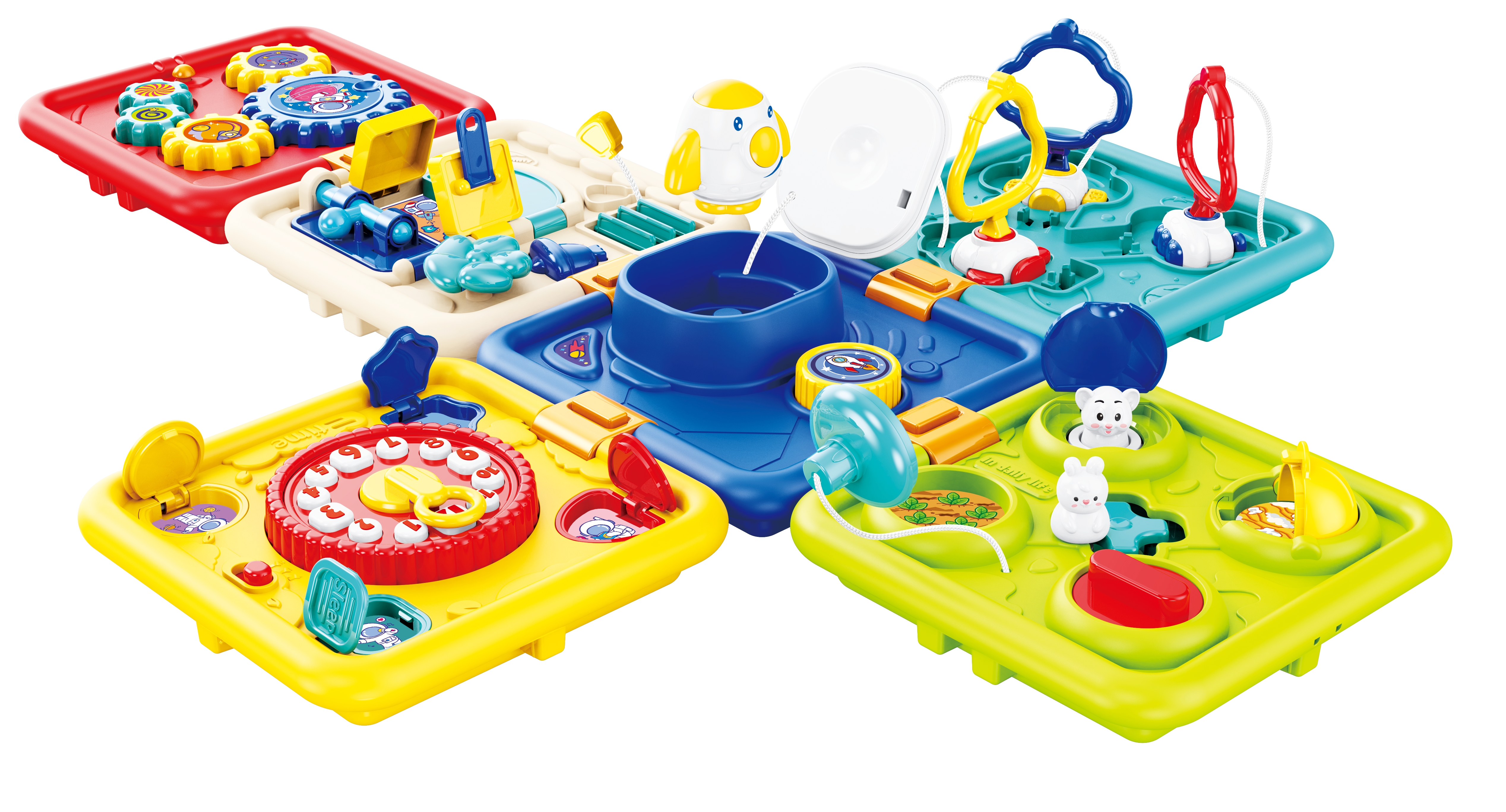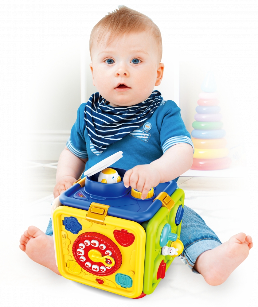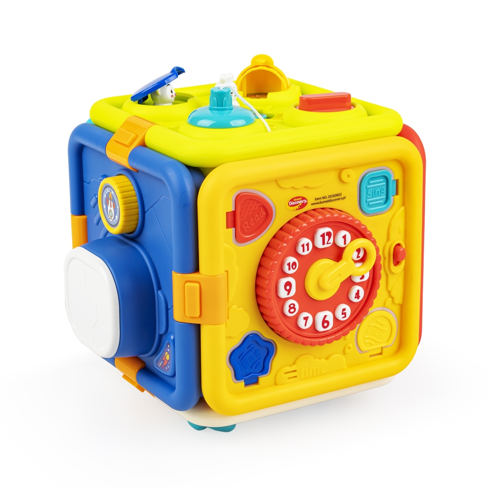 - 6 ścianek, a na każdej z nich inna zabawa: 1) naciśnij, a rakieta wystrzeli w górę, 2) prowadź króliczka, aby otwierać kolorowe klapki, 3) przesuwaj strzałkę zegara i słuchaj ciekawostek o porach dniach, 4) dopasuj i przekręć kluczyki, 5) odsłoń żaluzje, zamykaj i otwieraj drzwi na różne sposoby, 6) kręć trybikiem, aby wprawić w ruch kolejne;