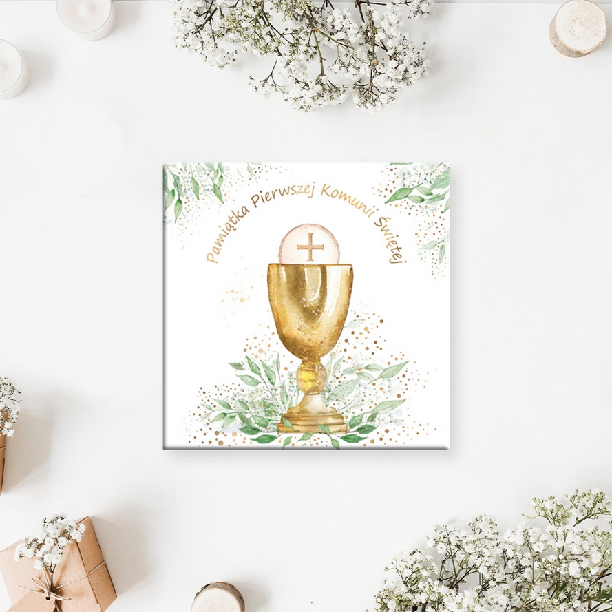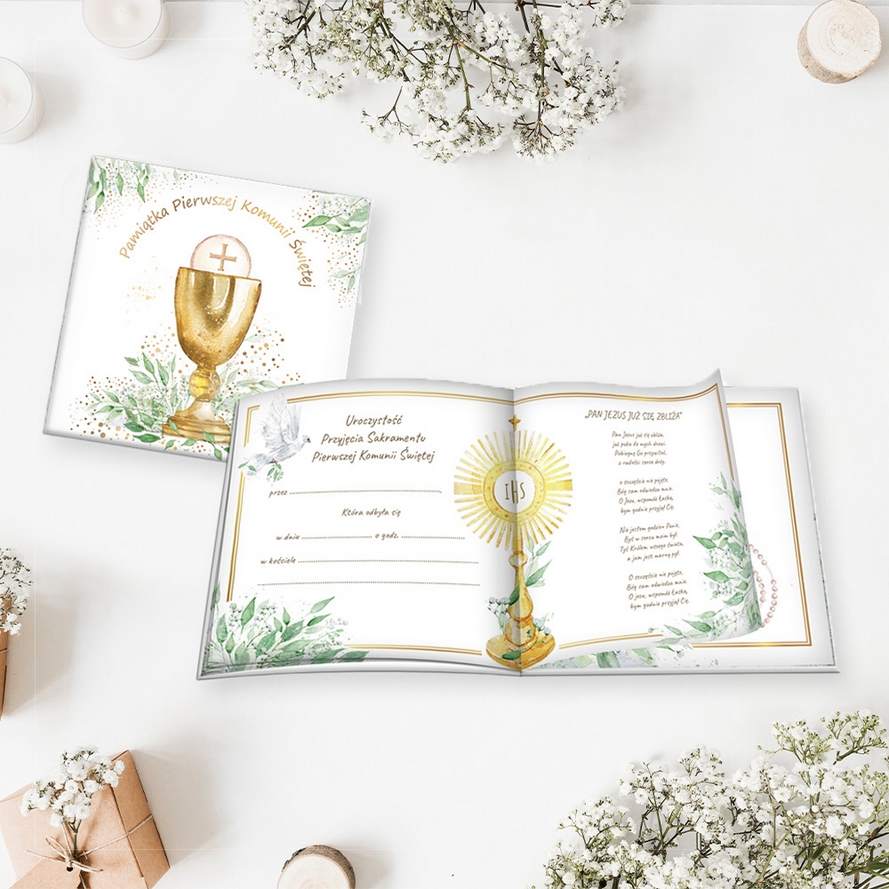 Książeczka KWD Pamiątka Komunijna EUCHARYSTIA wydrukowana na wysokiej jakości papierze formatu 22 x 22 cm. Okładka książeczki z gąbką i papierem z połyskiem, uszlachetniana jest złotem. Książeczka 12 stronicowa z tekstem i grafiką. Książeczka z kopertą na pieniądze
