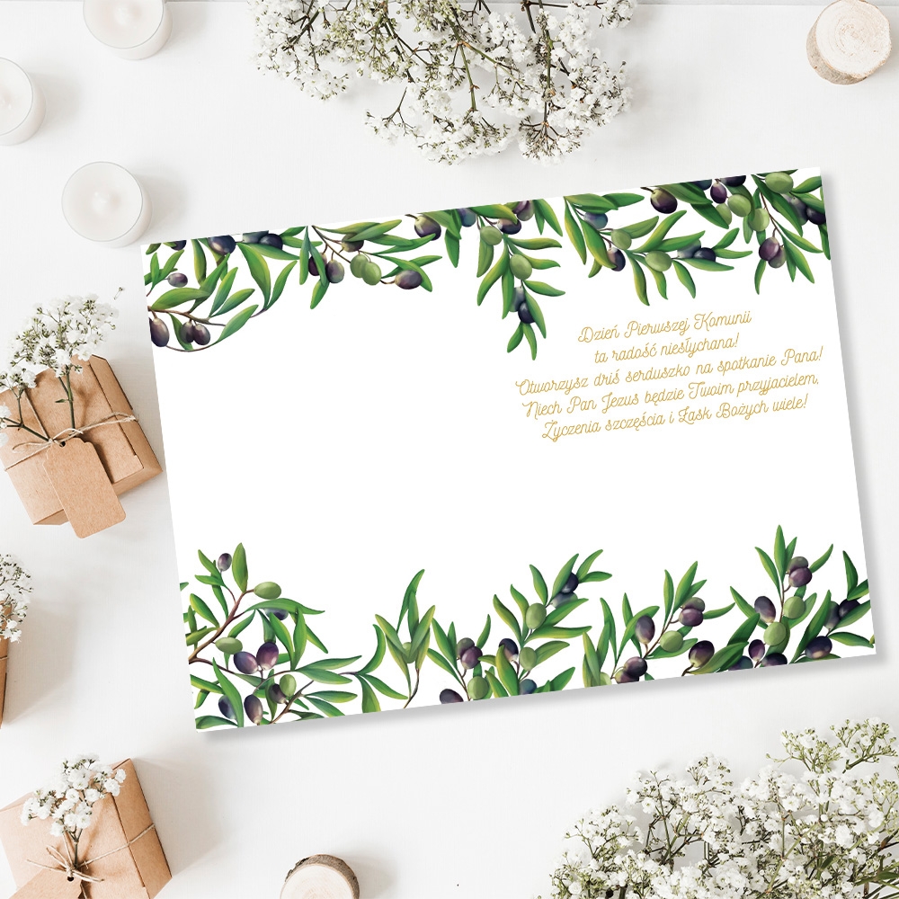 Karnet A5 KOMUNIA GOŁĄB Z OLIWKAMI wydrukowany na wysokiej jakości papierze formatu A5. Karnet uszlachetniony złotem i tłoczeniem. W zestawie koperta.