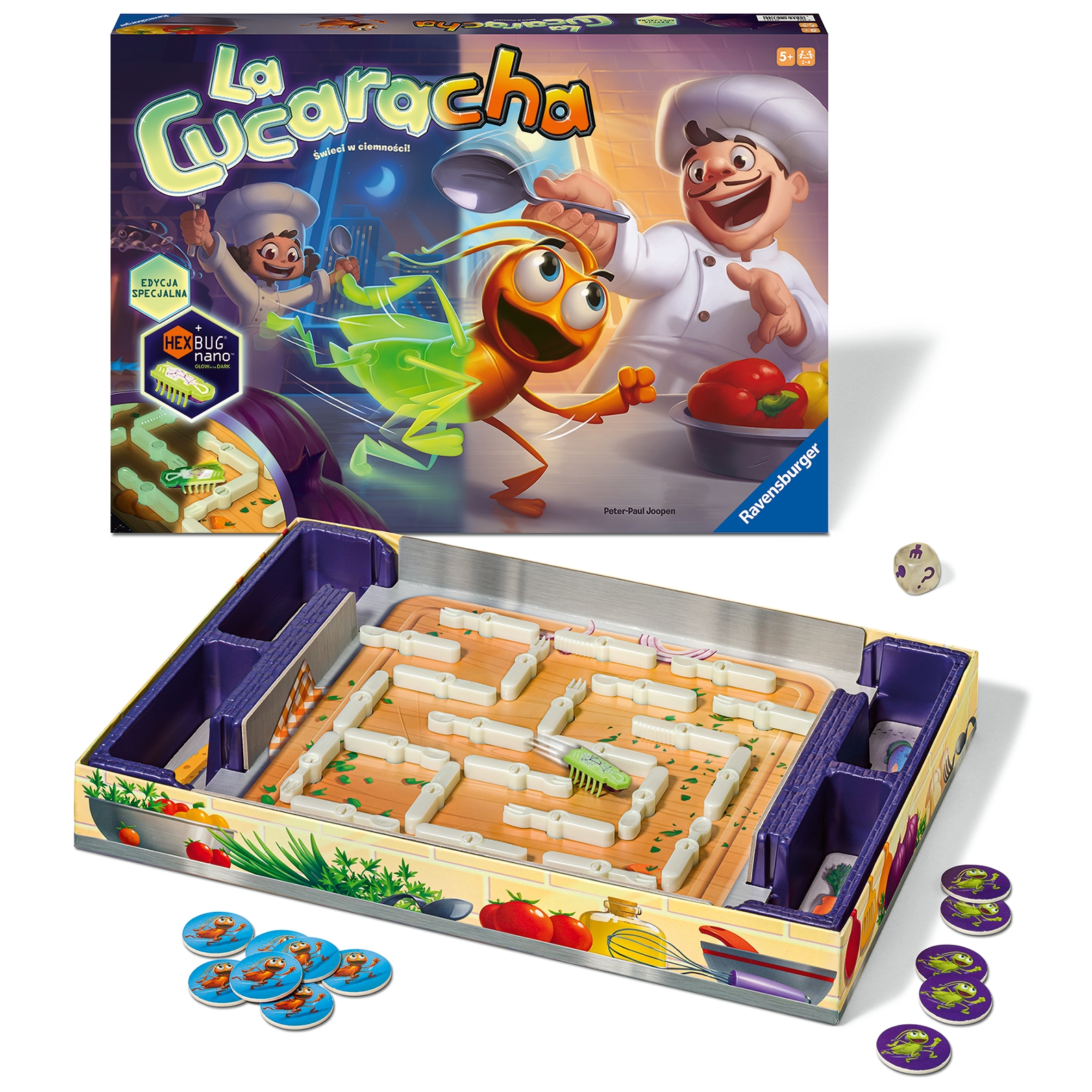 Wyłącz światło, a karaluch, kostka, sztućce, a nawet pułapki zaczną świecić! Odkryj klasyczną grę w nowej odsłonie. Ale czy to w świetle, czy w ciemności – w końcu karaluch po raz kolejny udowadnia, że ma własny rozum i wybiera zupełnie inną trasę niż oczekiwano! La Cucaracha to szybka i zabawna gra w pościg z oryginalnym robalem HEXBUG® nano™ świecącym w ciemności. Oryginalna edycja zdobyła już kilka nagród, w tym niemiecką nagrodę German Games Award dla najlepszej gry dla dzieci 2013 roku. Oto specjalna edycja klasycznej gry, świecąca w ciemności!