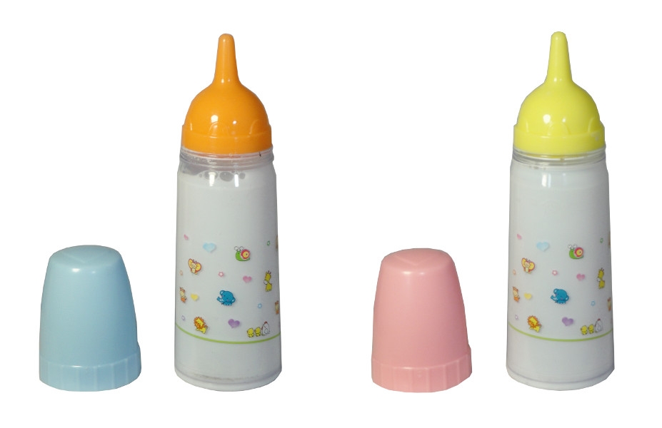 Butelka z mlekiem dla dzieci. Po przechyleniu płyn w butelce znika, co daje efekt wypijania napoju przez lalkę. Zabawka dla dzieci od 3 lat.