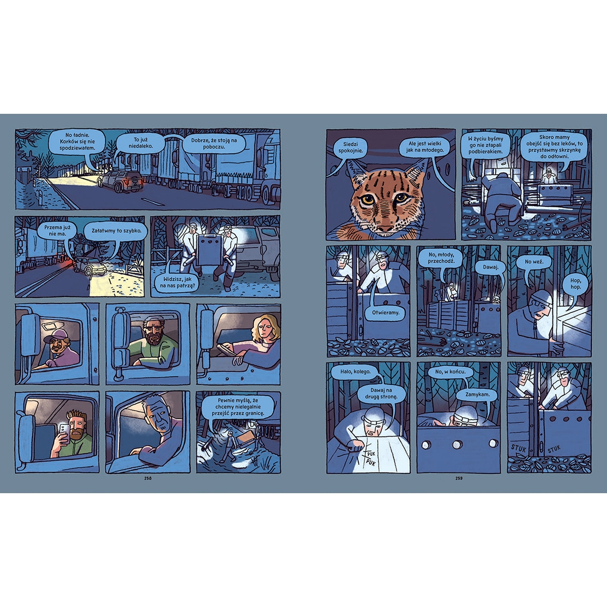 Skalny stracił brata i matkę – zginęli potrąceni przez samochód. Marysia przybłąkała się do opuszczonego pensjonatu, gdzie miejscowi zostawiali jedzenie dla bezdomnych kotów. Tajcha znaleziono przy drodze ze złamaną łapą. Przegib, jak każdy kot, uwielbiał pudełka… To tylko część rysiów, które miał okazję poznać Michał Figura ze Stowarzyszenia dla Natury „Wilk”. Aleksandra i Daniel Mizielińscy zamienili jego opowieści w pasjonujący komiks.
