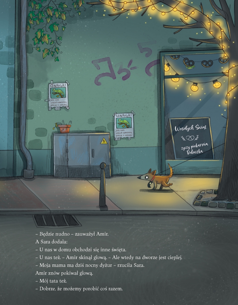 Sara i Amir z ulicy Słowiczej nie mają się z kim bawić. Inne dzieci zostały w domach – przez okna widać, że świętują. U Sary i Amira obchodzi się inne święta. Na dodatek ich rodzice są dziś w pracy. Zapowiada się nudny wieczór. Dzieci postanawiają więc pograć w piłkę, ale jak pech, to pech: piłka wpada im do ogródka zrzędliwego sąsiada! Choć trochę się boją, zaglądają do domu starszego pana, a wtedy…
