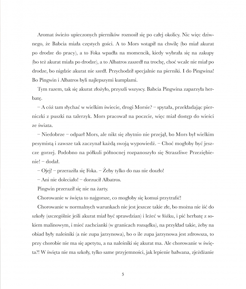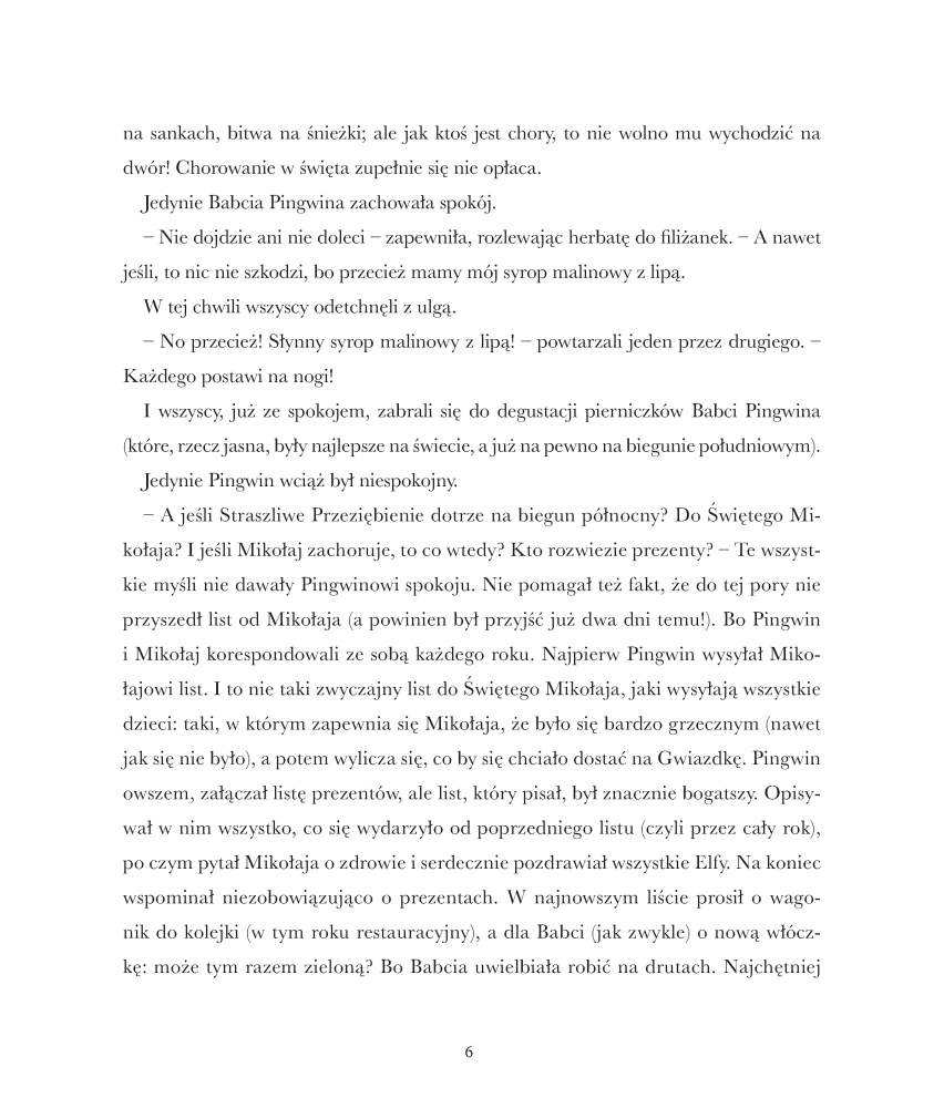 Bardzo się martwi, że Mikołaja dopadło Straszliwe Przeziębienie. Bo ZAWSZE odpisywał. A co jeśli teraz Święta są zagrożone? I dzieci nie dostaną prezentów? Pingwin wyrusza z misją ratunkową: nadaje siebie samego w przesyłce lotniczej na biegun północny – musi szybko dostarczyć Mikołajowi babciny syrop malinowy z lipą. Jemu zawsze pomagał! Czy uda mu się dotrzeć do celu i uratować Święta?