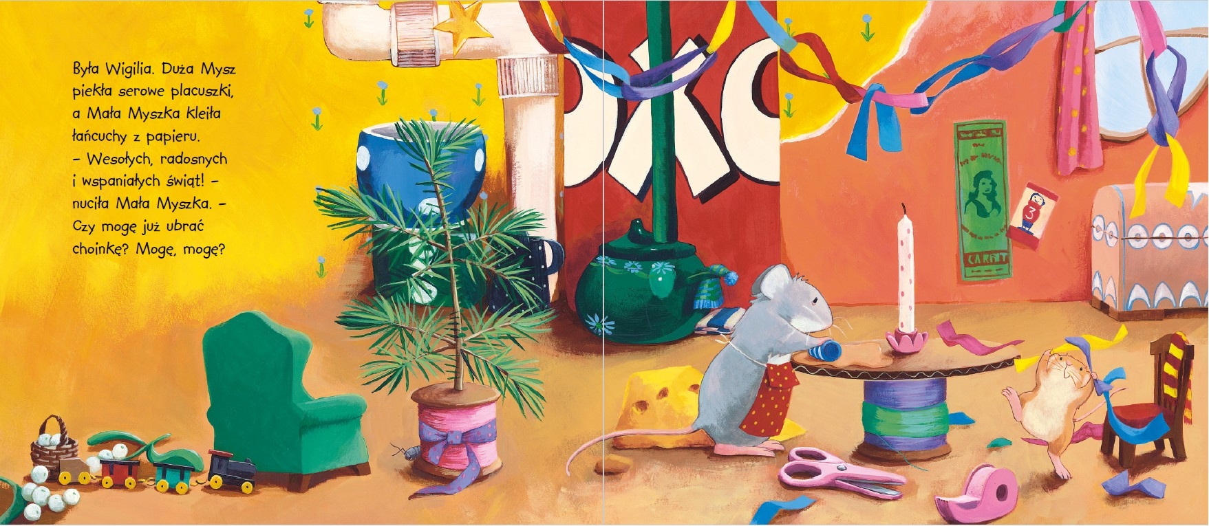 Jest Wigilia. Duża Mysz i Mała Myszka przygotowują się do świąt.