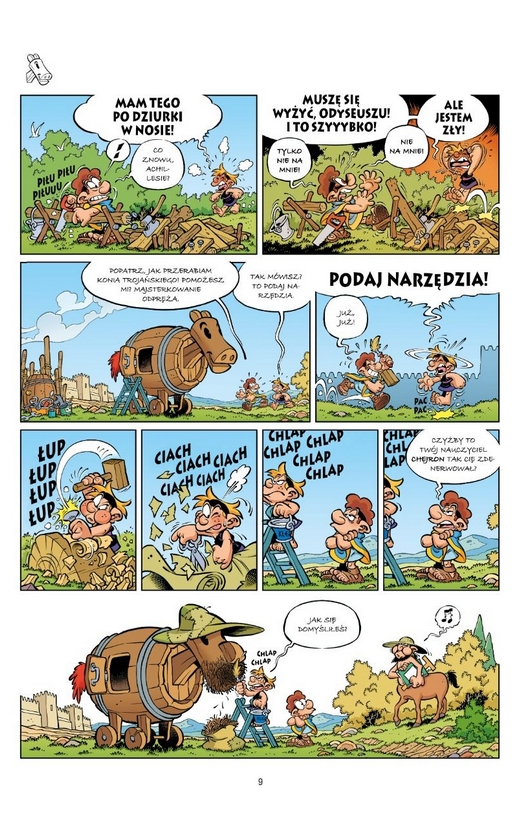 Trzynasta część humorystycznej opowieści o kandydatach na bogów i herosów starożytnego Olimpu. Tym razem bohaterowie wraz z wojskami greckimi płyną pod Troję, tyle że niektórzy nie dotrą tam zbyt szybko, bo Odyseusz stwierdza, że woli orać plażę, a Achillesowi mama nie pozwala... Kiedy już znajdą się na miejscu, napotkają leniwego węża morskiego, spróbują zapobiec wylewowi rozeźlonej rzeki Skamander, a przede wszystkim będą się głowili, jak zdobyć wielkie miasto. Ale czym są takie wyzwania dla rozrabiaków wspieranych radami żartownisia Tauruska?