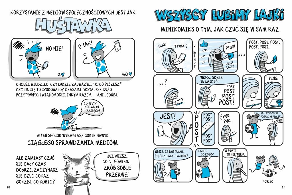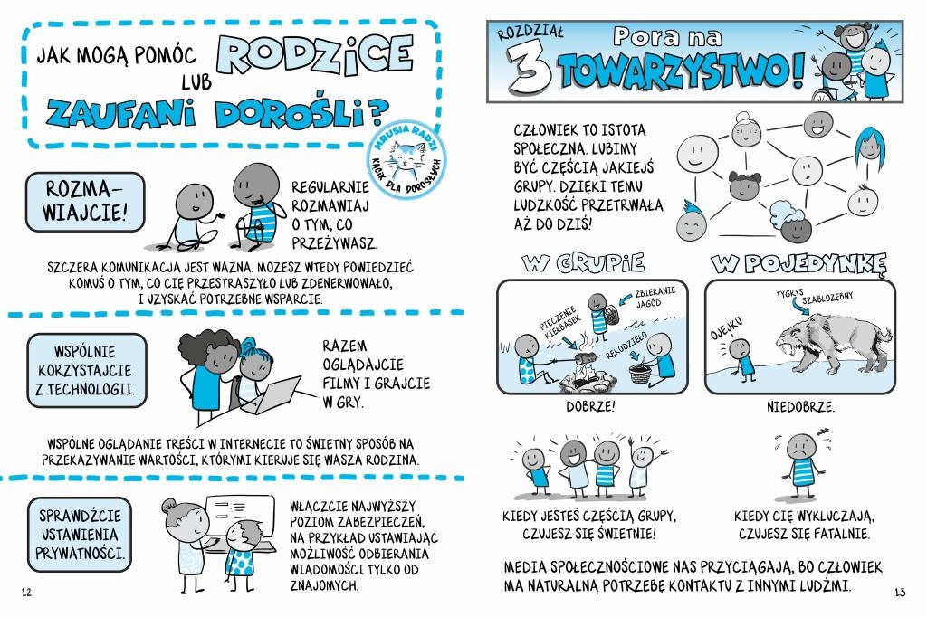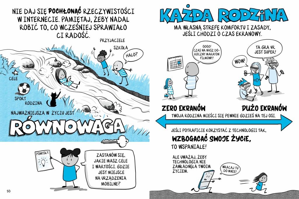 Dzięki zabawnym rysunkom, ilustrującym różne sytuacje z życia, młodzi czytelnicy dowiedzą się, jak dbać o higienę cyfrową i jak odpowiedzialnie korzystać z urządzeń.