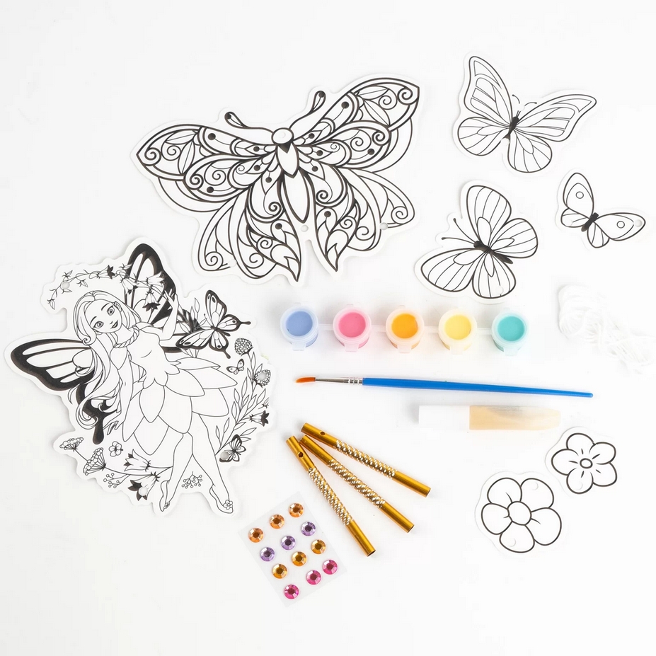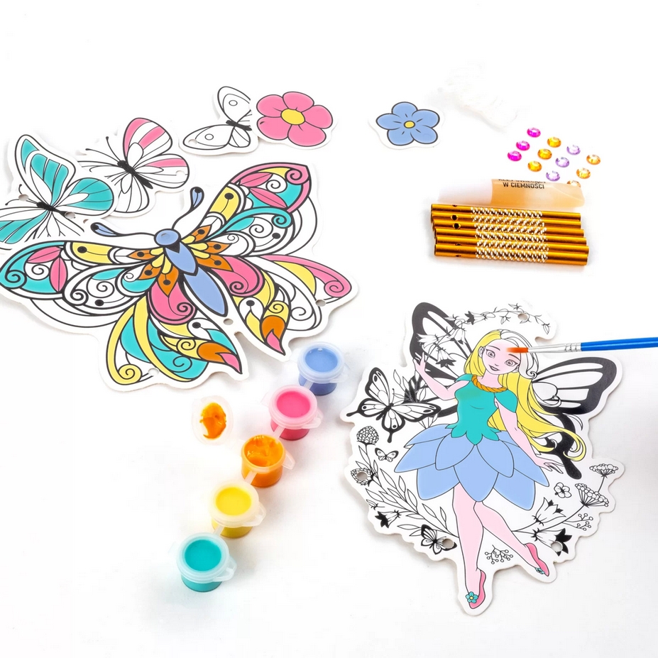 Zaprojektuj swoje własne dzwonki z tekturowym szablonem wróżki i pięknego motylka otoczonymi baśniowymi elementami, które pięknie ozdobią pokój. Zestaw zawiera wszystko co jest potrzebne do stworzenia niesamowitej dekoracji.