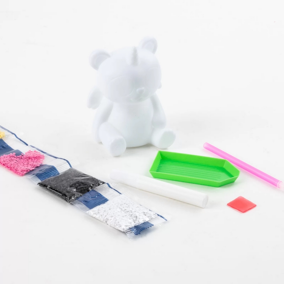 Najpierw stopniowo nanieś klej na wybrane miejsca figurki, a następnie wybierz kolor diamencików i wysyp je na tackę. Używając dołączonego rylca, nakładaj diamenciki na figurkę, dopasowując je do powierzchni pokrytych klejem. Kontynuuj pracę, aż panda zostanie całkowicie ozdobiona mieniącymi się kryształkami i zacznie pięknie błyszczeć. Efekt końcowy to unikalne dzieło sztuki 3D, które wspaniale ozdobi pokój lub stanie się wyjątkowym prezentem. Świetnie nada się również jako zabawka.