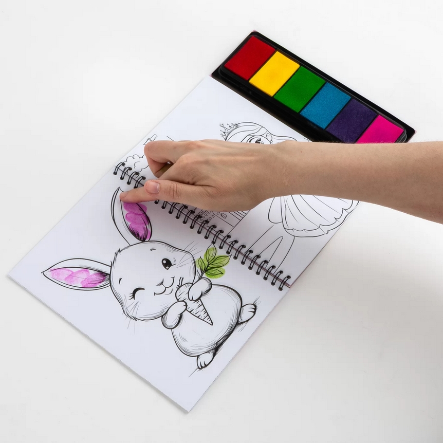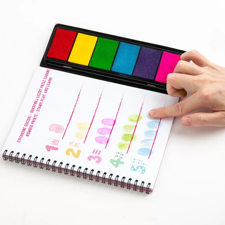 Dotknij gąbeczki z wybranym kolorem kilkukrotnie, możesz także przyłożyć palec do kilku gąbeczek, aby zmieszać ze sobą barwy i utworzyć nowe kolory. Przyciśnij paluszki w odpowiednich miejscach na arkuszu. Baw się eksperymentując z kolorami i różnymi odciskami. A może chcesz zabawić się w detektywa? Ta wyjątkowa książeczka zawiera gąbeczki z kolorowymi tuszami, 21 kolorowanek oraz 8 kart edukacyjnych