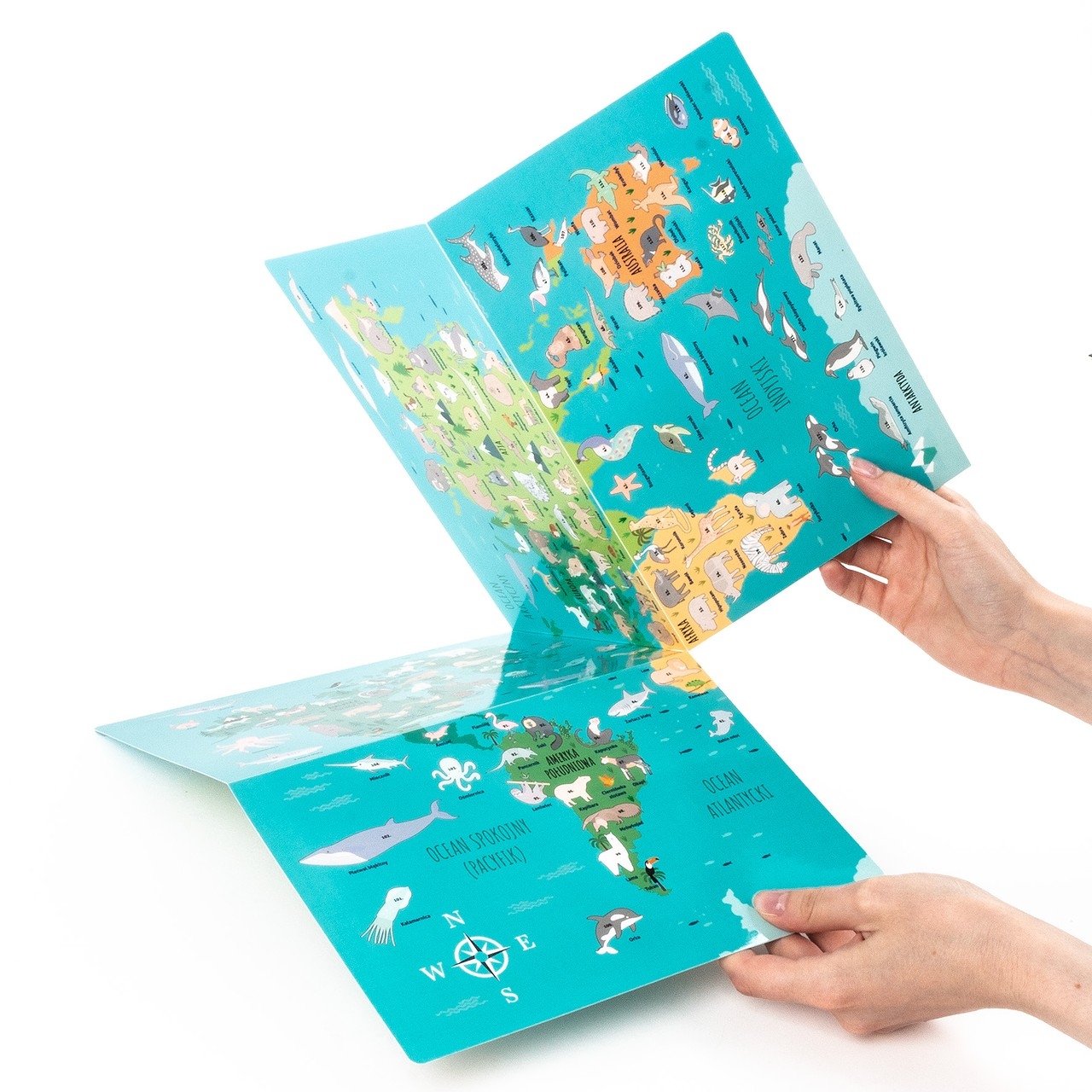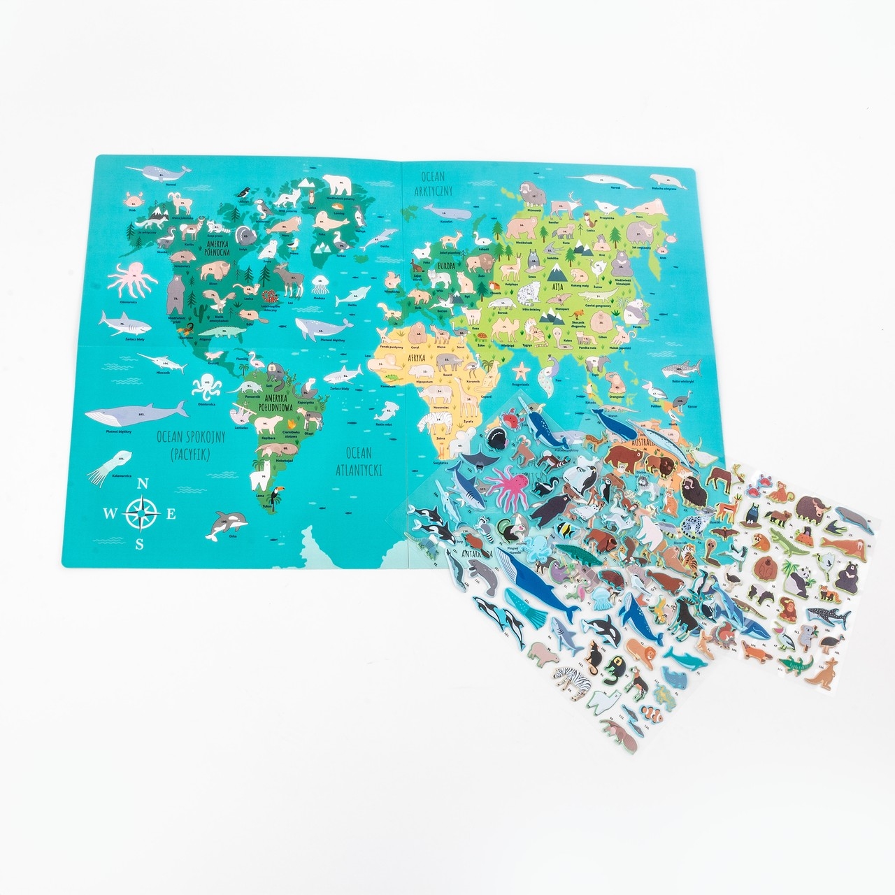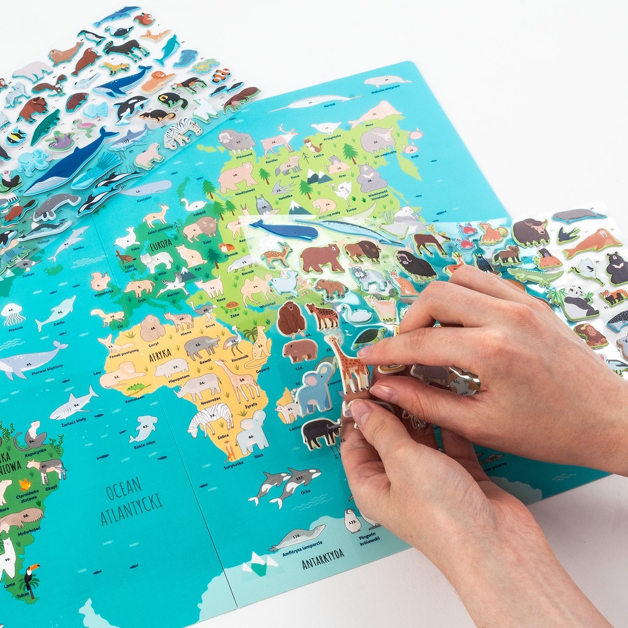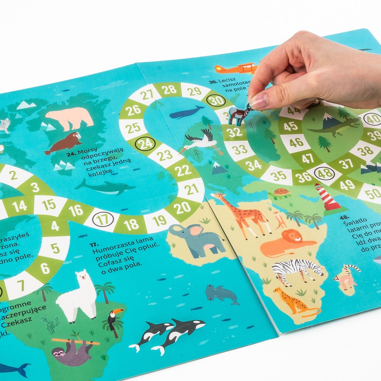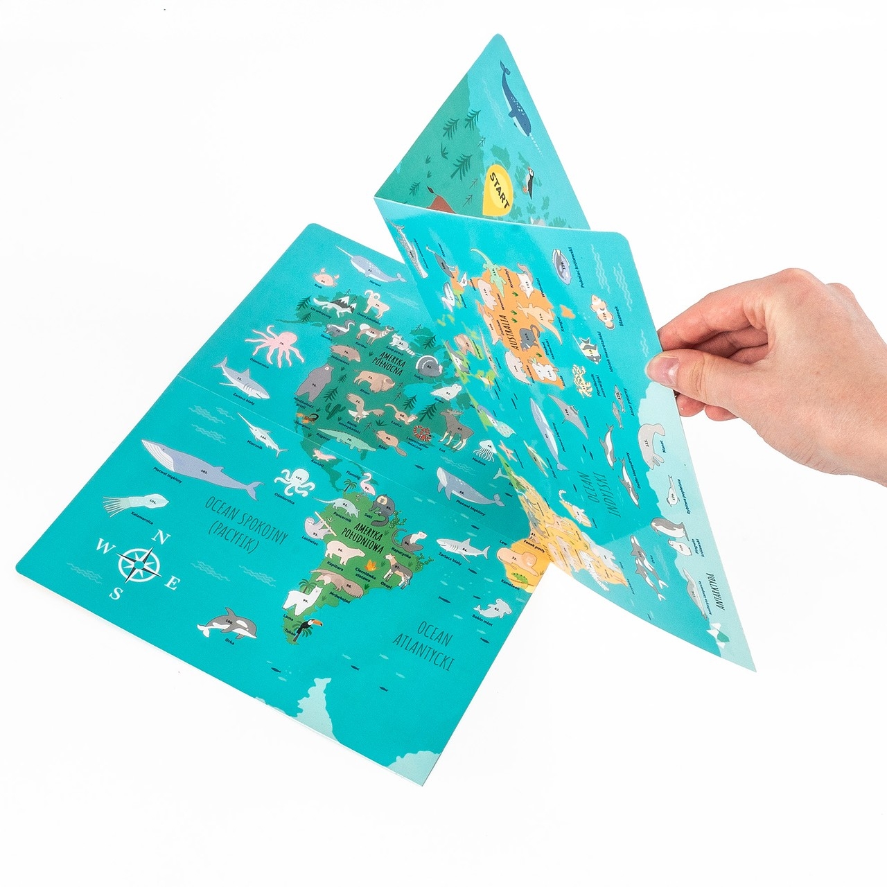 Poznaj pingwiny w lodowej scenerii Antarktyki, lwy na afrykańskich sawannach oraz kangury skaczące po australijskich równinach. Zestaw zawiera naklejki ze zwierzętami, które można umieszczać na mapie zgodnie z oznaczeniami, aby zobrazować ich naturalne środowiska. Ta niezwykła zabawa rozwija jednocześnie wiedzę geograficzną i biologiczną. Dodatkowo, na odwrocie mapy czeka niespodzianka wciągająca gra planszowa, która dostarczy wielu godzin rodzinnej rozrywki.