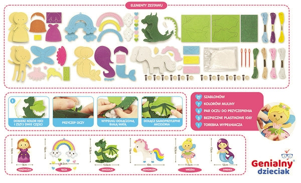 W zestawie znajduje się 44 elementy potrzebne do uszycia aż 6 kolorowych postaci: księżniczki, jednorożca, syrenki, wróżki, tęczy i dinozaura.