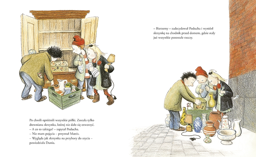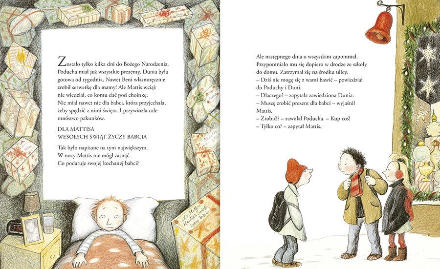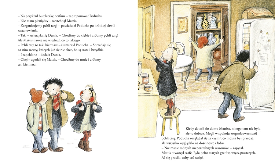 Mattis chce kupić babci prezent pod choinkę. Ale co by to mogło być? I skąd wziąć pieniądze? Dunia i Poducha wymyślają, żeby urządzić pchli targ i w ten sposób zarobić na prezent. Korzystają z chwili, gdy u Mattisa nie ma nikogo w domu, i wynoszą kilka nikomu niepotrzebnych rzeczy. Tak im się przynajmniej wydaje…