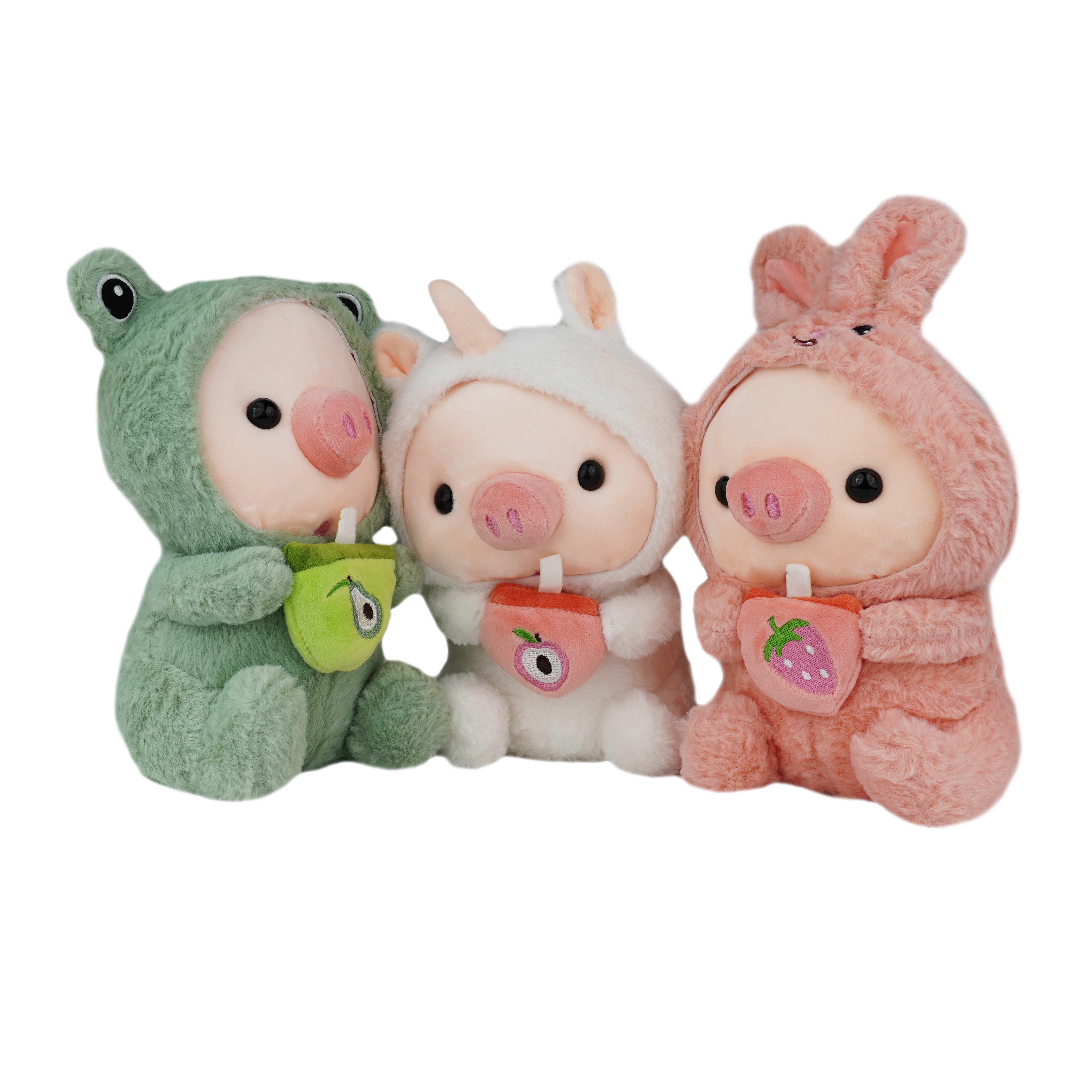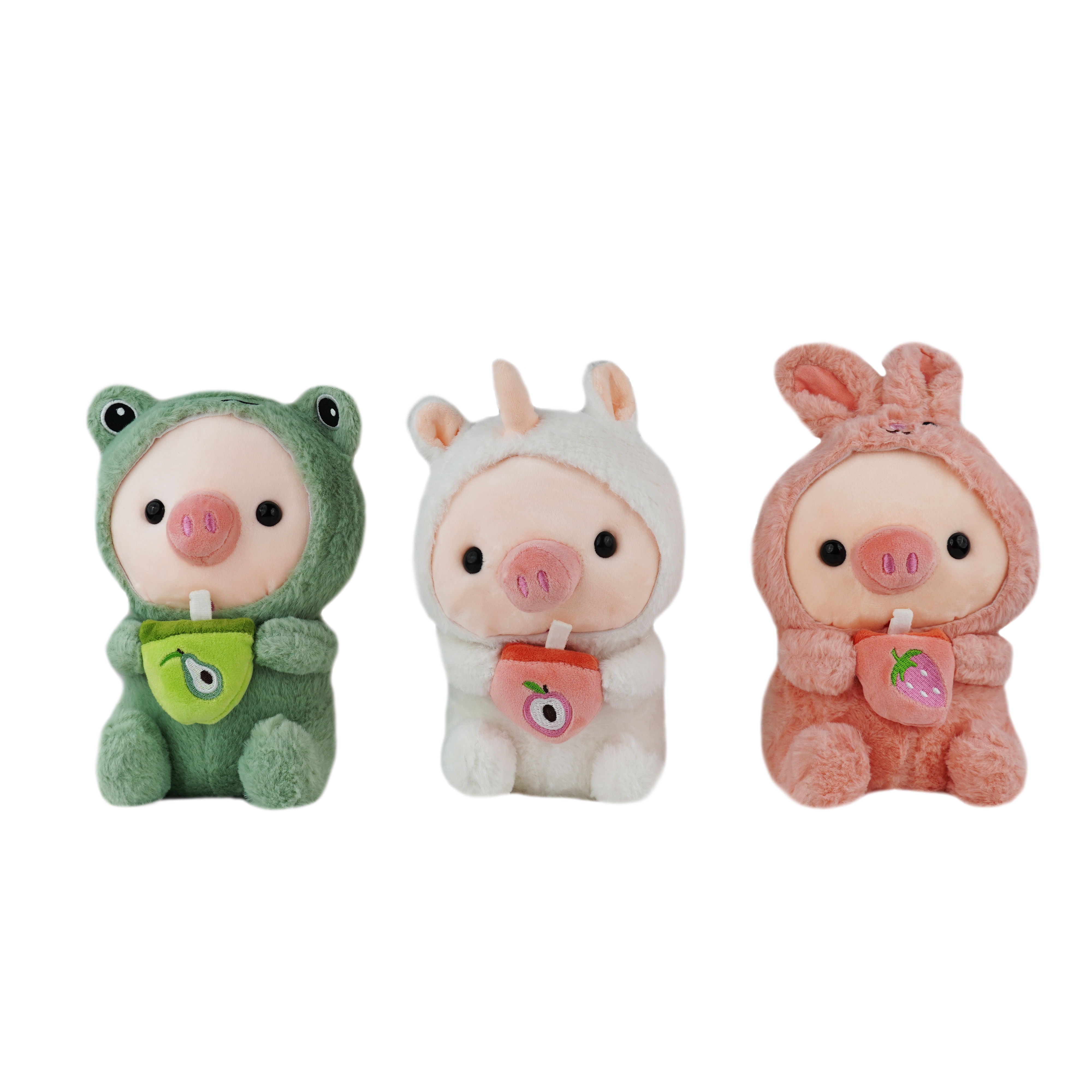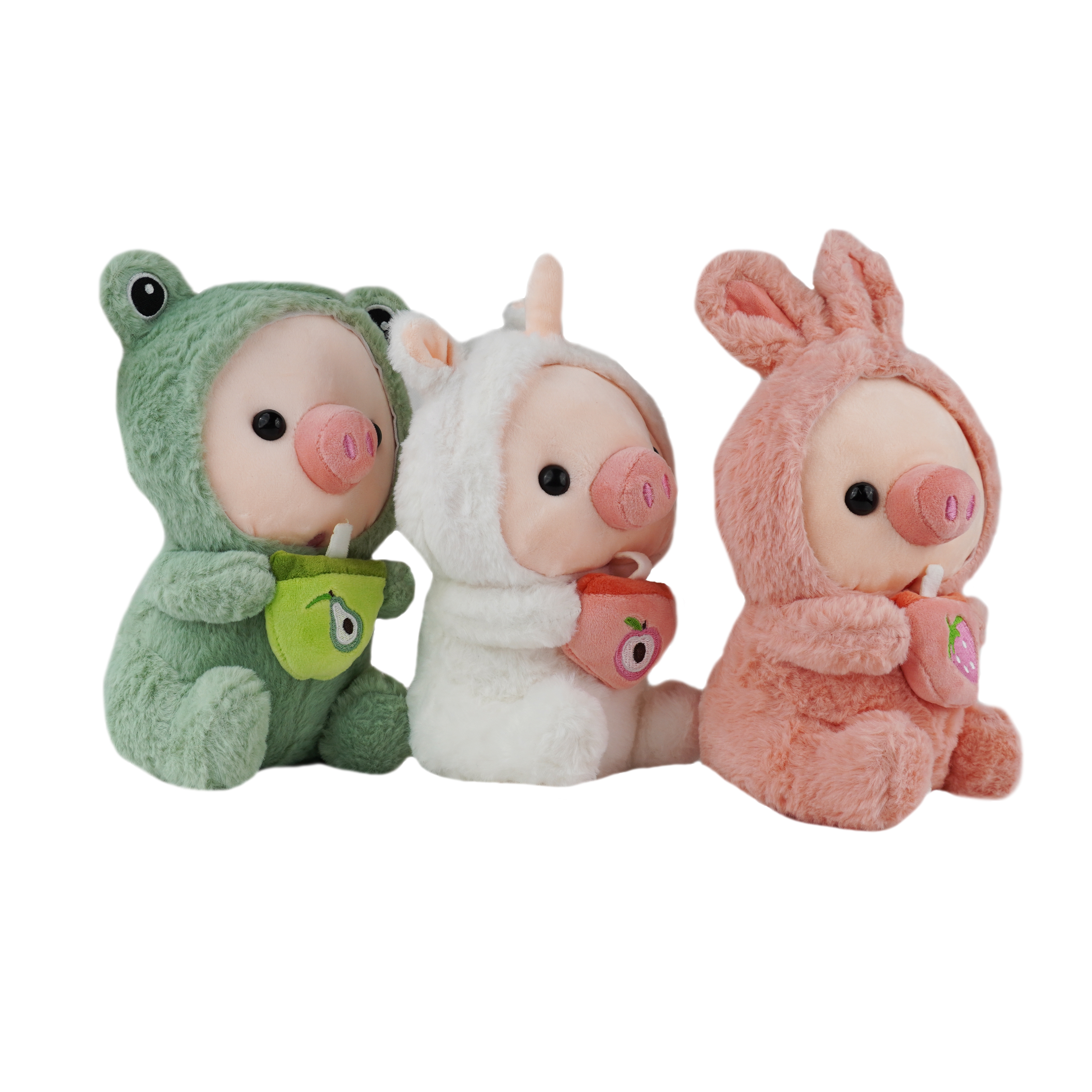 Żaba, jednorożec, króliczek. To wszystko urocze ubranka, w które może być przebrany ten prosiaczek! Do tego wielki kubek soku... musi mu być naprawdę przytulnie.
