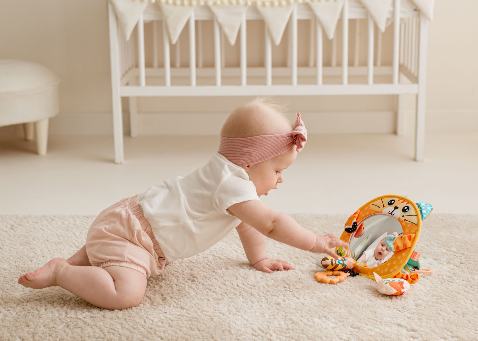 Ten śliczny kotek zapozna dzidziusia z własnym odbiciem, a wszystko za sprawą bezpiecznego lusterka, zdobiącego jego brzuszek. Zabawka wyposażona została w dodatkowe niespodzianki, a są nimi grzechotka, gryzak oraz szeleszcząca pszczółka. Materiały, z których wykonany został kotek i przyczepione do niego elementy odznaczają się zróżnicowanymi fakturami, przez co eksplorujący je maluch może rozwijać zdolności poznawcze, ucząc się odkrywać świat za pomocą zmysłów. Zabawkę można postawić, za pomocą zapinanej na rzep podstawki, lub powiesić na szczebelkach łóżeczka czy uchwycie wózka, na doszytych do zabawki zawieszkach i troczkach.