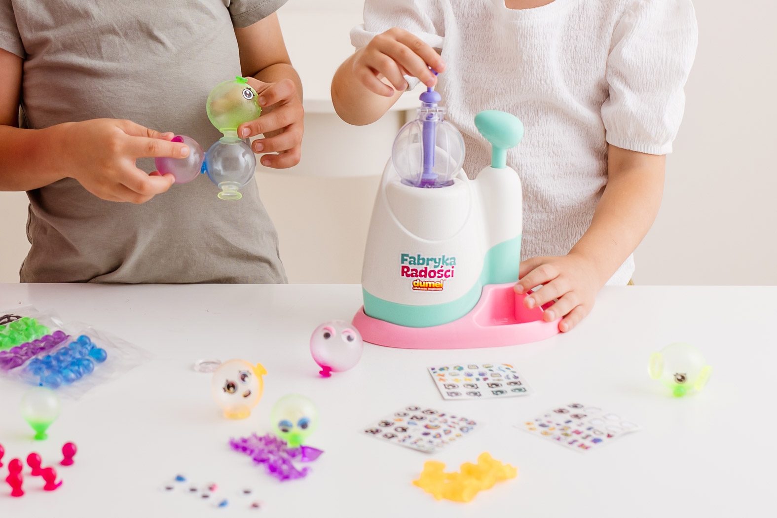 Ta odlotowa maszyna zapewni moc kreatywnej zabawy, i to bez baterii, kleju oraz podgrzewania. W zestawie znajdziesz wszystko, czego potrzeba, aby stworzyć kolorowe, balonowe stworki. Przy pomocy specjalnej maszynki nadmuchaj baloniki do zaznaczonego na podziałce poziomu, wyjmij je i połącz ze sobą w zabawne stworki-potworki. Dołączone do zestawu akcesoria, takie jak uszka, oczka czy skrzydełka, pozwolą ci ozdobić stworzone postacie, aby nadać im niepowtarzalnego wyglądu.
