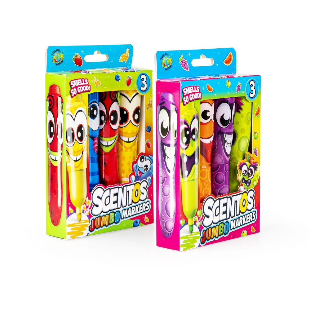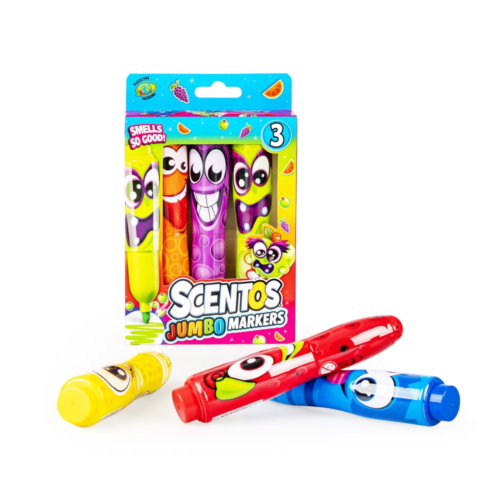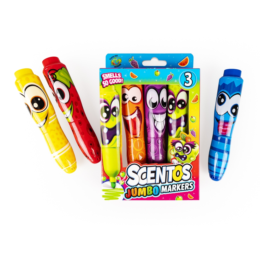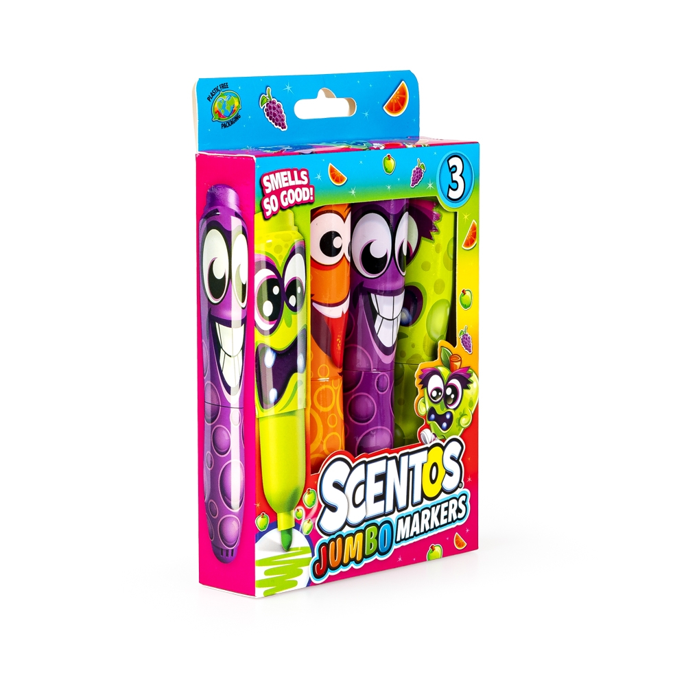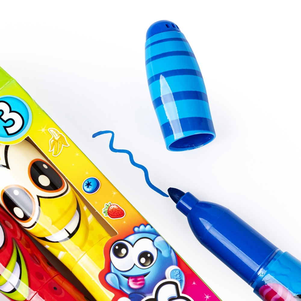 Wesołe buźki i pachnąca zawartość! Zestaw trzech grubych markerów zapewni podwójną przyjemność z pisania i rysowania. Markery różnią się zarówno kolorem, buźką, jak i zapachem. Każdy z nich nawiązuje do zapachu innego owocu.