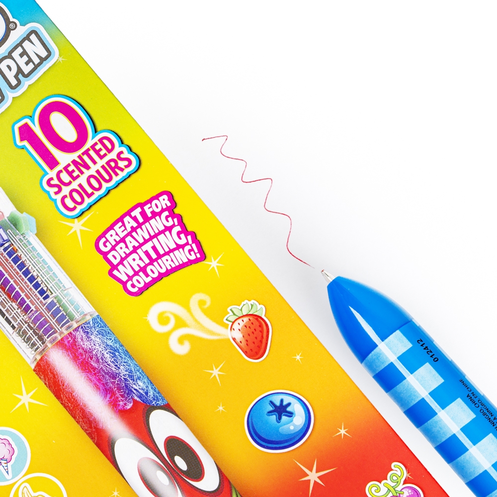Jeden długopis, a w nim aż dziesięć różnych kolorów! To praktyczne rozwiązanie sprawdzi się z pewnością zarówno w domu i w szkole, jak i w podróży, pozwalając zaoszczędzić miejsce w bagażu. Dodatkowo, długopis ozdobiony jest wesołą buźką, co czyni go przyjaznym i atrakcyjnym dla malucha, a każdy z zawartych w nim kolorowych wkładów pachnie w inny, słodki sposób.