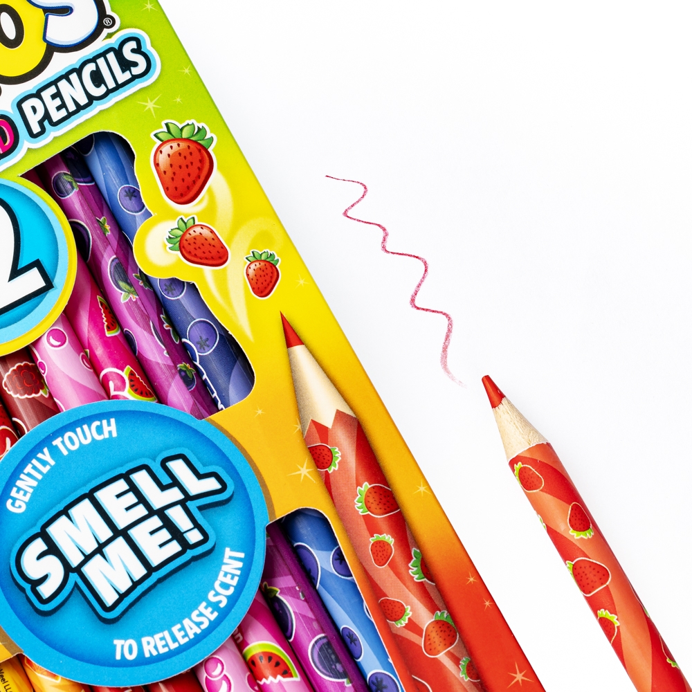 Owocowa eksplozja zapachu! Zestaw kryje w sobie dwanaście ołówkowych kredek, a każda z nich ma inny kolor. Poszczególnym kredkom odpowiada inny, słodki zapach, przywołujący na myśl owoce lub słodycze. O inspiracji zapachowej informuje nadruk na każdej z kredek.