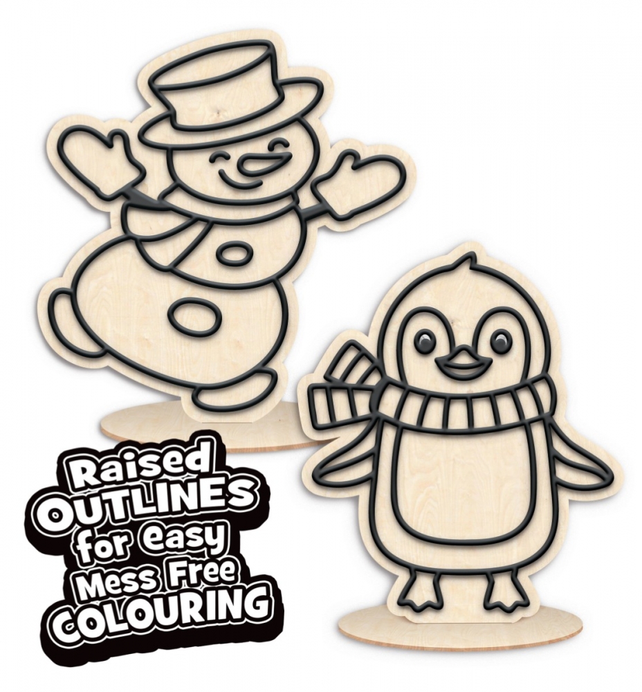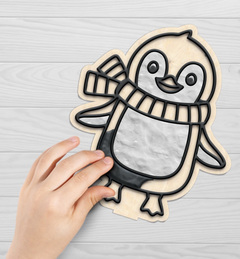 Zestawy do kolorowania z plasteliny na drewnianych szablonach z trójwymiarowym efektem. Umożliwiają stworzenie kolorowych figurek. Naniesione kontury stanowią wyraźny przewodnik, ułatwiając precyzyjne wypełnianie kolorową gliną. Dwie figurki