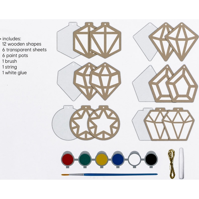 Zestaw witraży do pomalowania, doskonale wpasowują się jako dekoracja uwydatniając świąteczny wystrój. Zestaw zawiera: 12 drewnianych wzorów, 6 przeźroczystych arkuszy do pomalowania, 6 pojemników na farbę, pędzel, sznurek oraz klej.