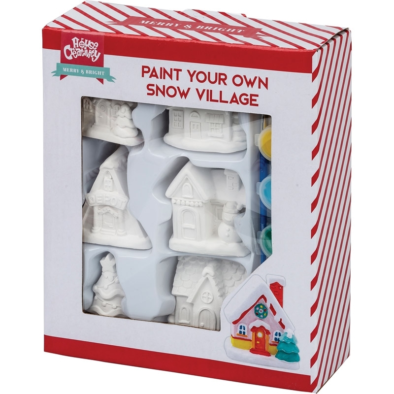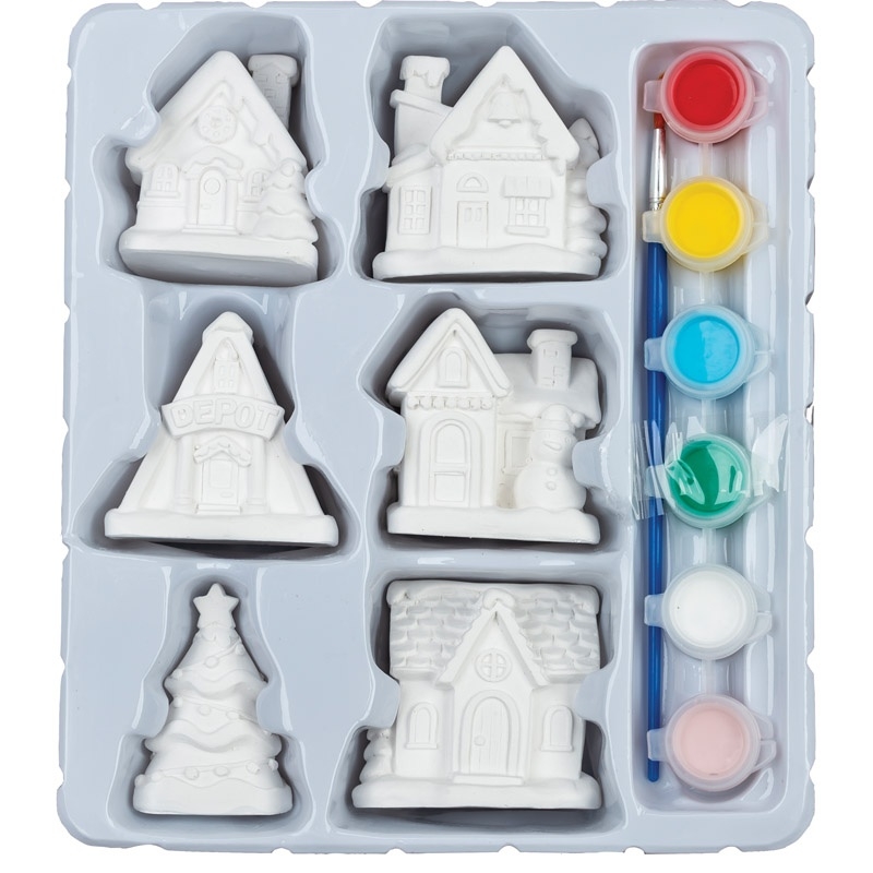 Zestaw gipsowych domków komponujących się w świąteczną wioskę, można postawić je w dowolnym miejscu. Zestaw zawiera: 6 domków gipsowych , 6 pojemników z farbą i pędzelek.