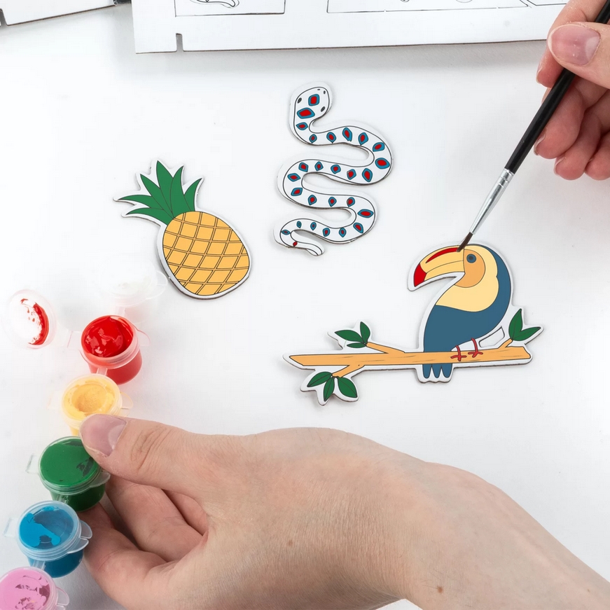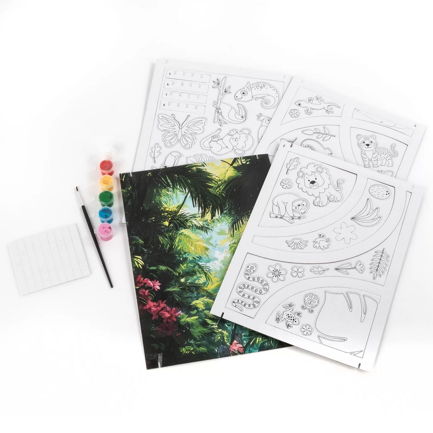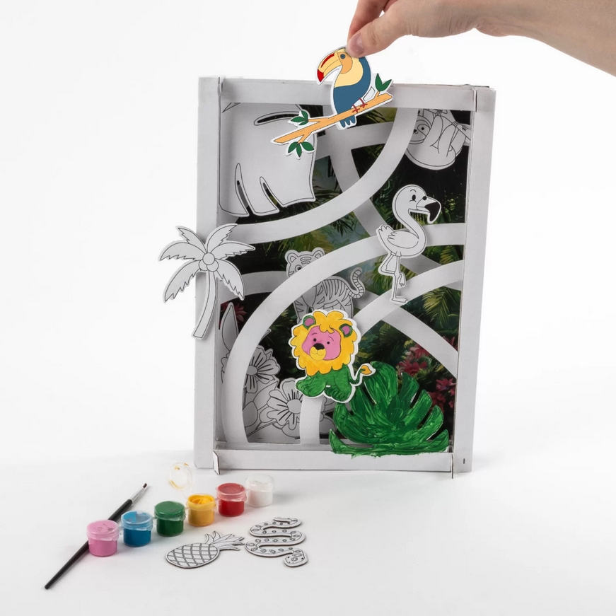 Zbuduj magiczny trójwymiarowy obraz w tropikalnym klimacie, dzięki kompletnemu zestawowi zawierającemu 4 ramki, 6 farb z pędzelkiem, 50 tekturowych elementów 3D oraz 65 samoprzylepnych kwadracików.