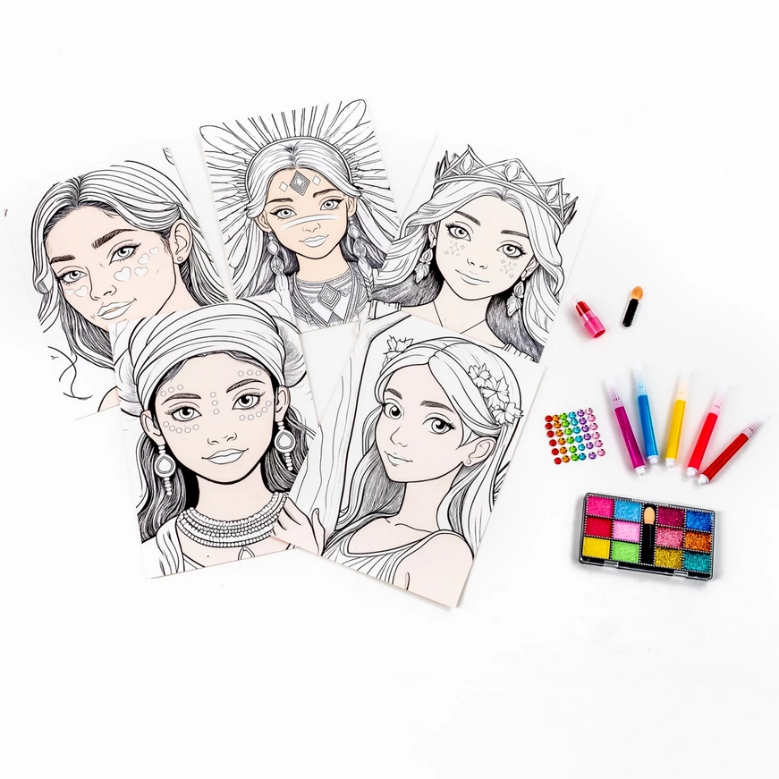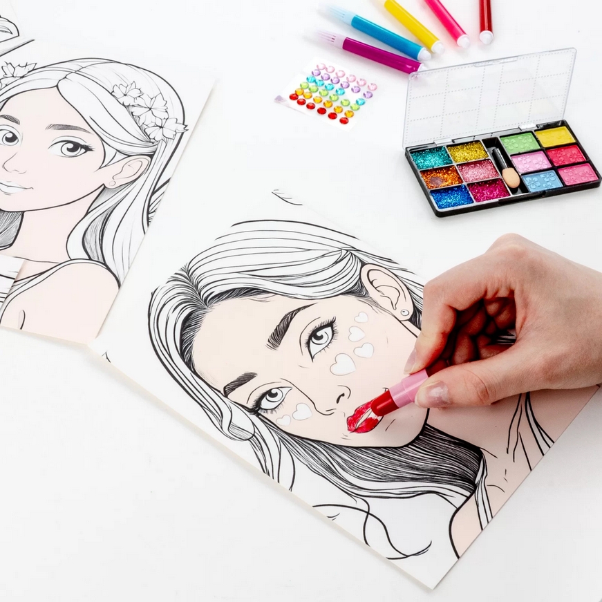 Plansze do kolorowania make-up. Dla małych artystek, które pragną wcielić się w rolę prawdziwej makijażystki. Zestaw obejmuje 5 różnorodnych plansz z motywami księżniczek do malowania, 1 szminkę, 6 mini markerów, 36 diamentów oraz 12 cieni. Dzięki bogatemu wyposażeniu można stworzyć unikatowe makijaże dla każdej z postaci – od delikatnych, pastelowych stylizacji po odważne, kolorowe kreacje.