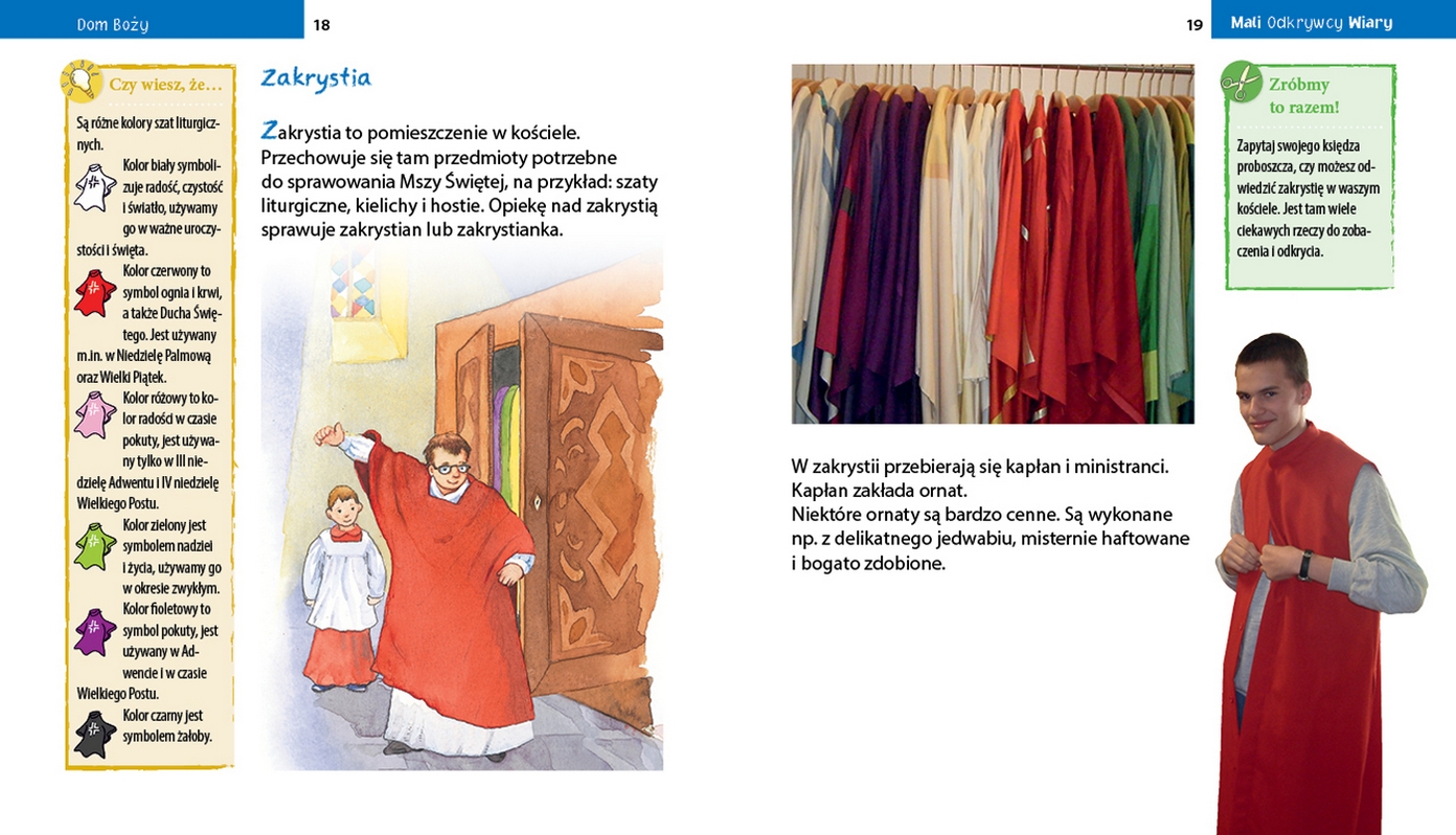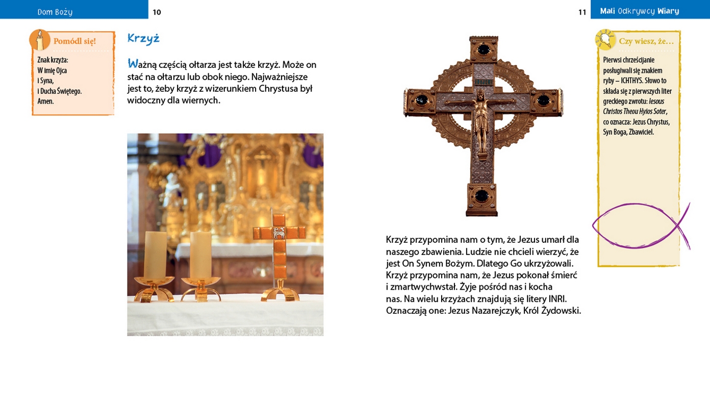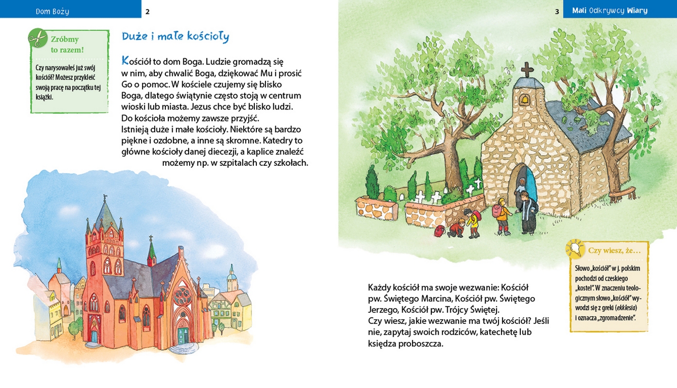 W tym tomiku dowiemy się wszystkiego, co istotne i ciekawe o świątyniach, które są domem Boga. Mali chrześcijanie przekonają się, że w każdym kościele – niezależnie od tego, czy jest monumentalną katedrą, skromną budowlą czy kaplicą szkolną – możemy modlić się do naszego Tatusia w niebie.