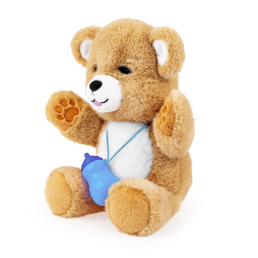 Pogłaszcz go po główce lub brzuszku i nakarm dołączoną do zestawu buteleczką, a z radością odwdzięczy się „misiowymi” odgłosami, zamykając przy tym i otwierając oczka. Zwierzak posiada dwie aktywne łapki. Naciśnięcie pierwszej uruchamia funkcję nagrywania i odtwarzania nagranego dźwięku, a naciśnięcie drugiej uruchamia urocze melodie.