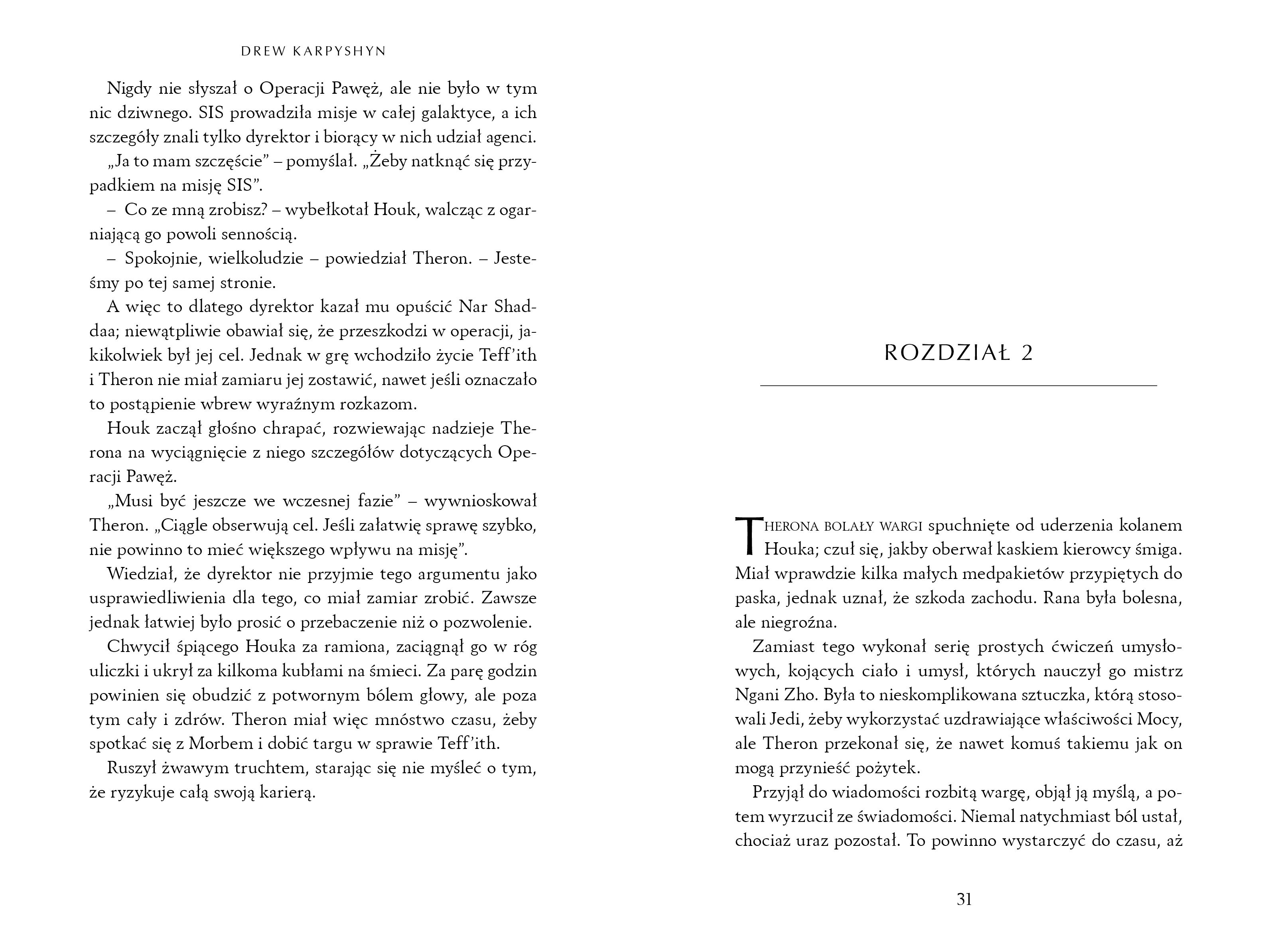Jednak bezwzględnej determinacji Karrid dorównuje niezłomna zawziętość Therona Shana, którego niewyrównane porachunki z Imperium mogą odmienić losy wojny. Choć jest synem mistrzyni Jedi, Theron nie włada Mocą – za to jak jego słynna matka ma we krwi ducha rebelii. Jako czołowy tajny agent Republiki odkrył i zniszczył arsenał superbroni Sithów, zadając Imperium poważny cios. Wydaje się więc stworzony do śmiałej i niebezpiecznej misji, której celem jest zakończenie panowania „Zwycięskiej Włóczni”.