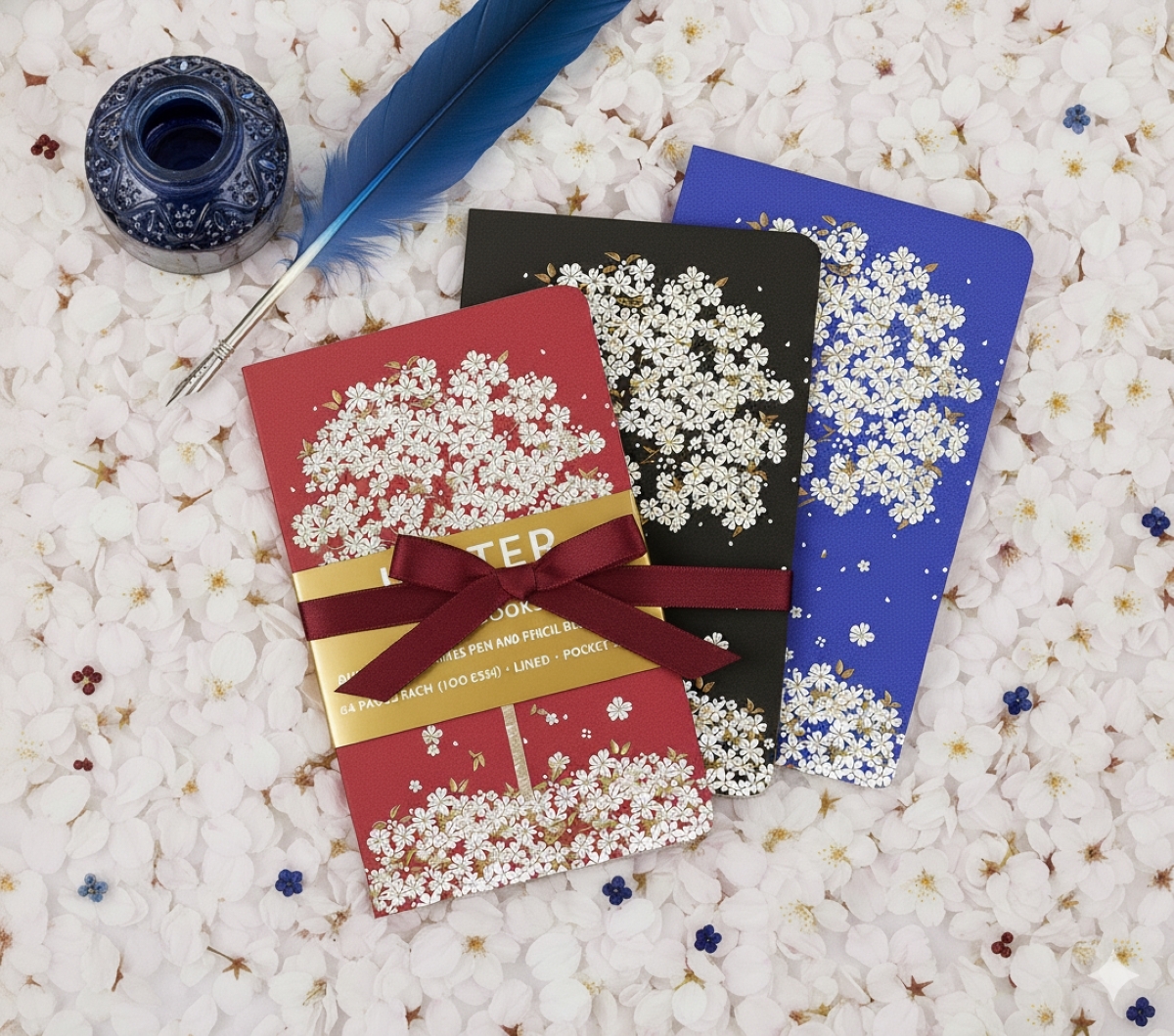 Zestaw trzech szytych notesów z serii Jotter marki Peter Pauper Press. W skład zestawu wchodzą 3 notesiki w kieszonkowym rozmiarze, każdy z okładką przedstawiającą ten sam motyw, ale w innej kolorystyce.