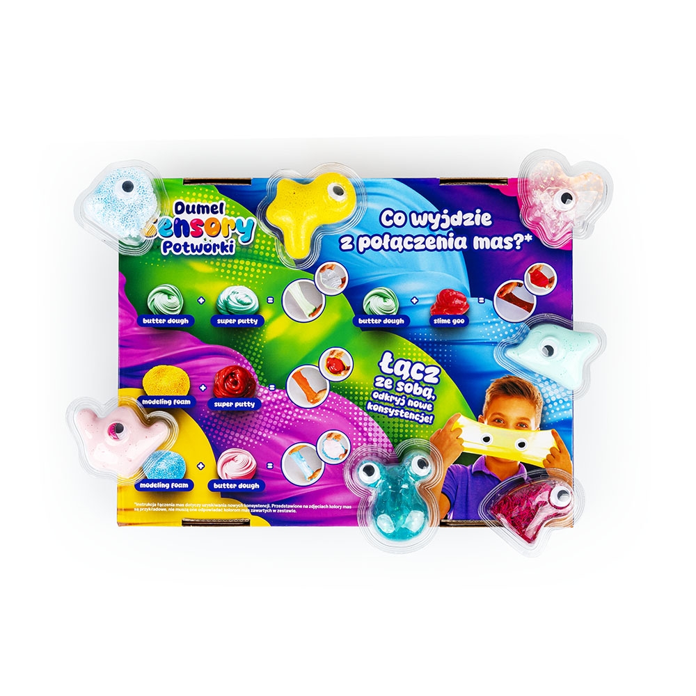 Kolorowe stworki zapraszają do sensorycznej zabawy! W potworkowych kształtach kryją się masy o różnych konsystencjach i zabawkowe oczka do ozdoby.