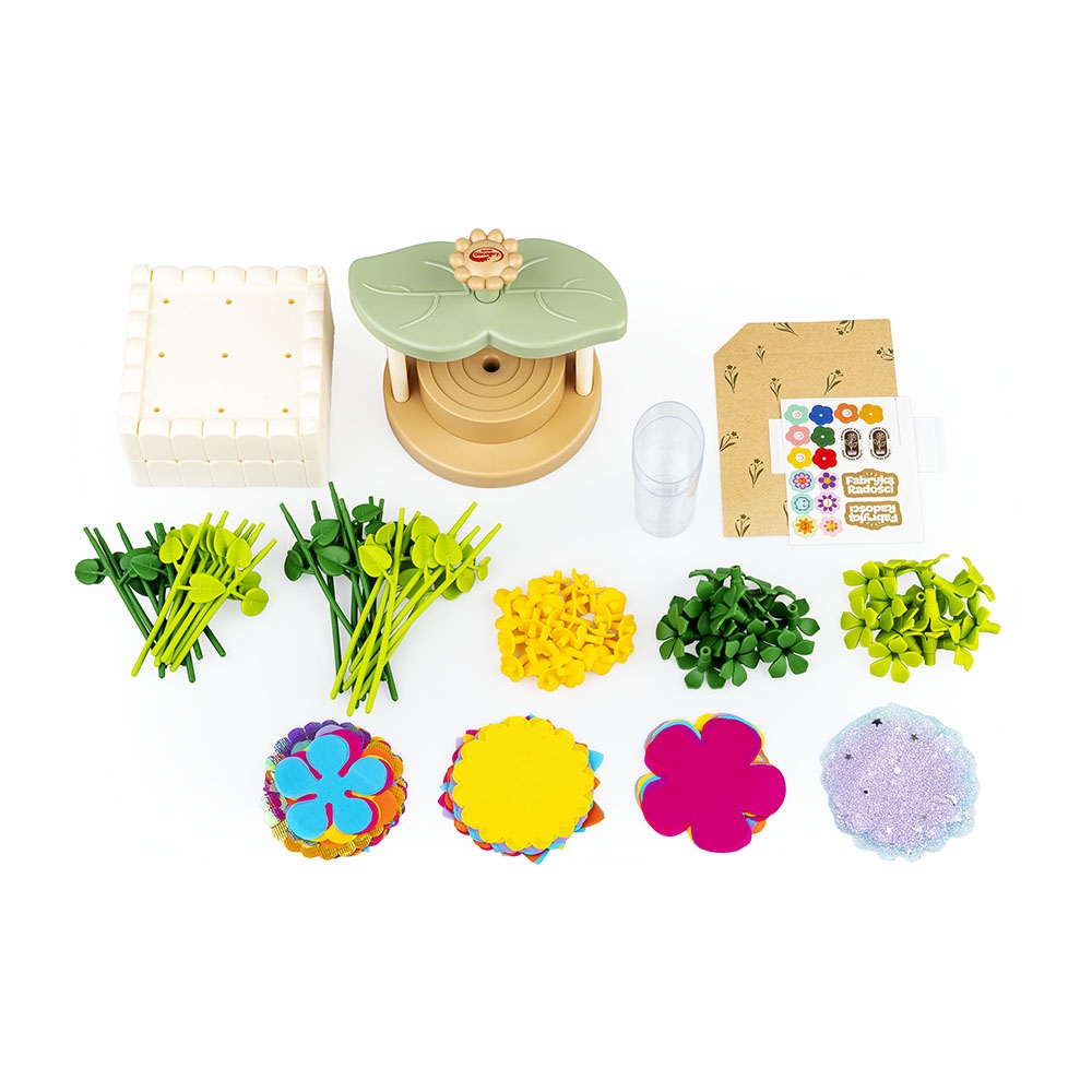 - w zestawie maszynka do łączenia elementów w główkę kwiatka, 95 kolorowych płatków, 28 łodyg, szypułki, kwiatowe środki oraz akcesoria do wyeksponowania gotowych kwiatów;