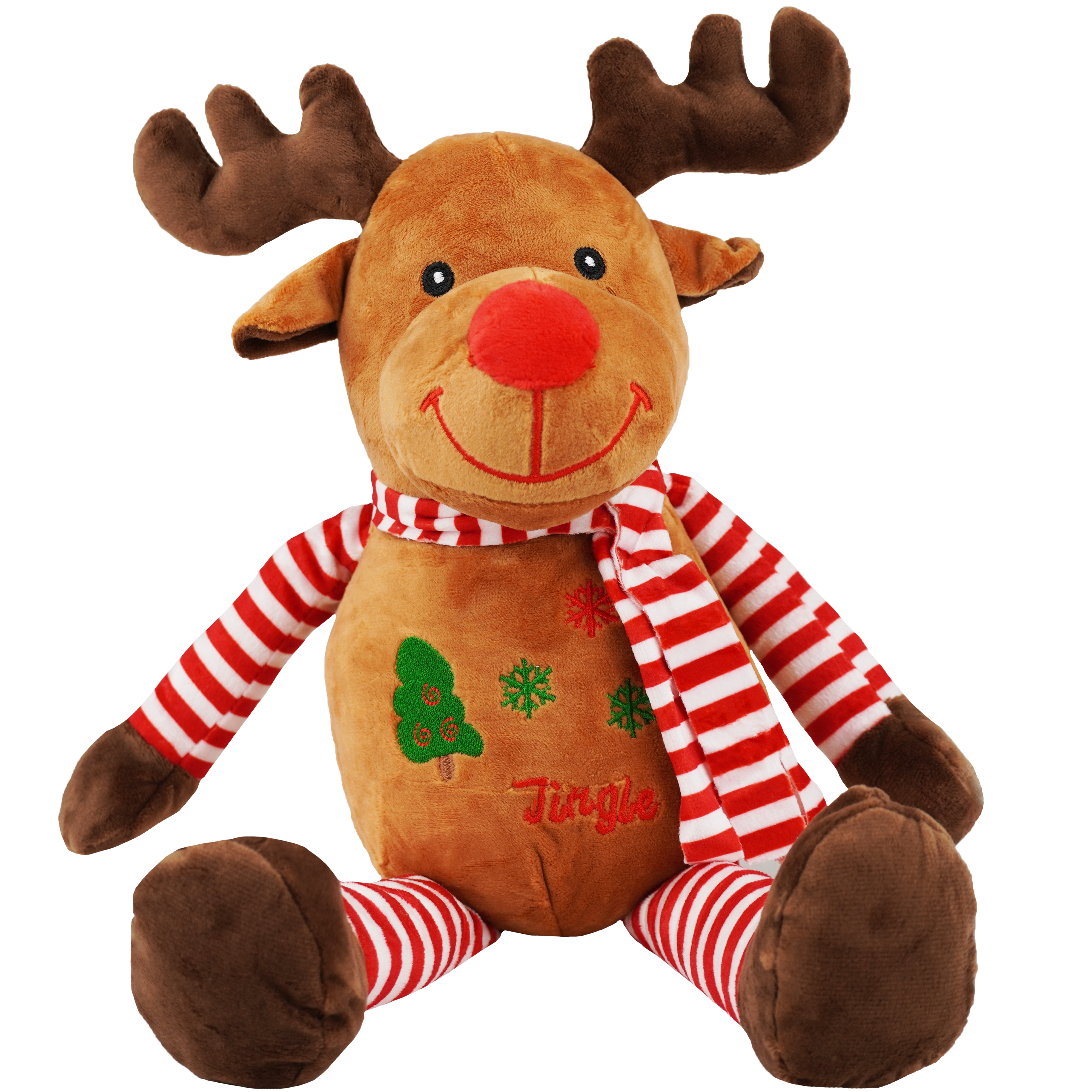 Pluszowy renifer w szaliku i z biało-czerwonymi kończynami - idealny element świątecznego wystroju.